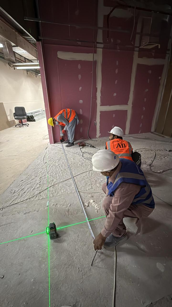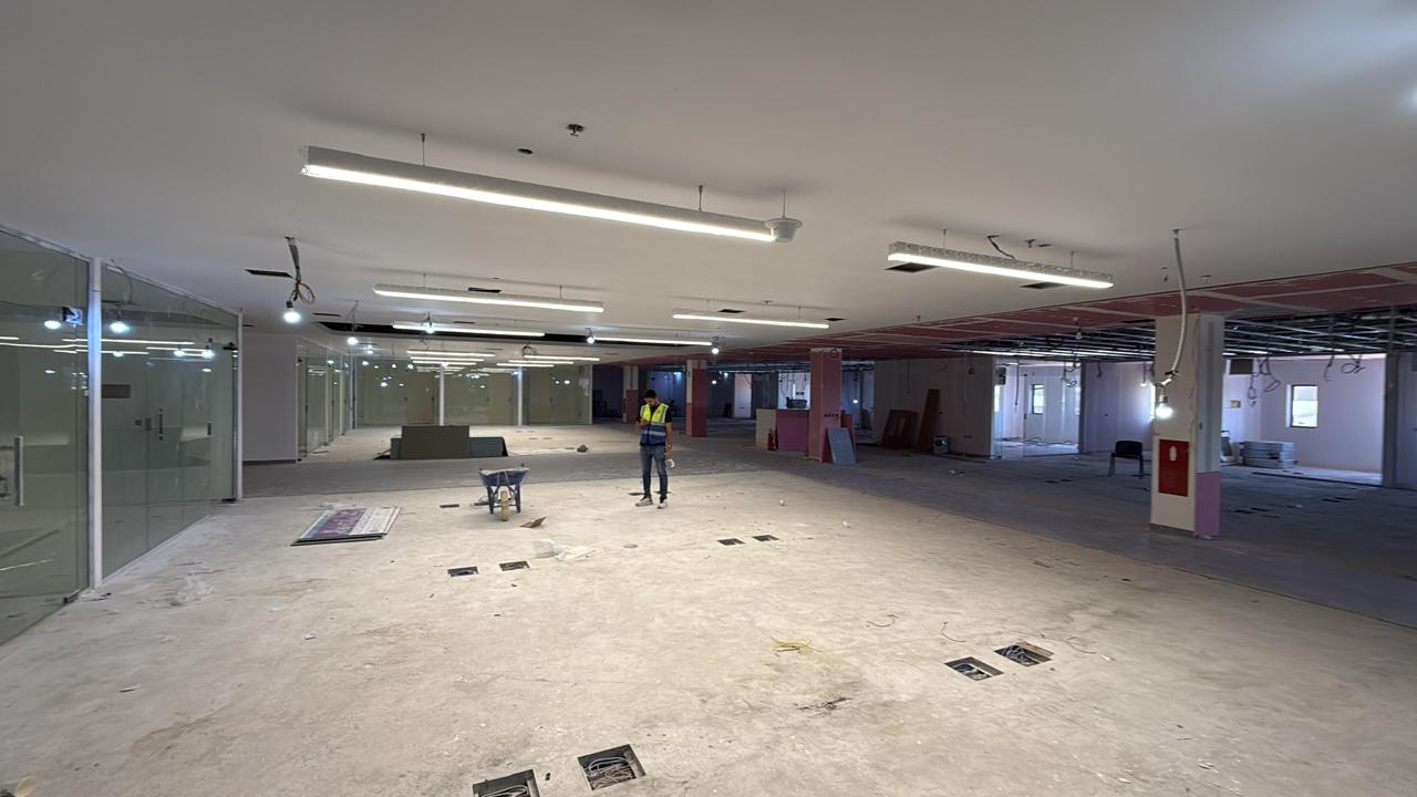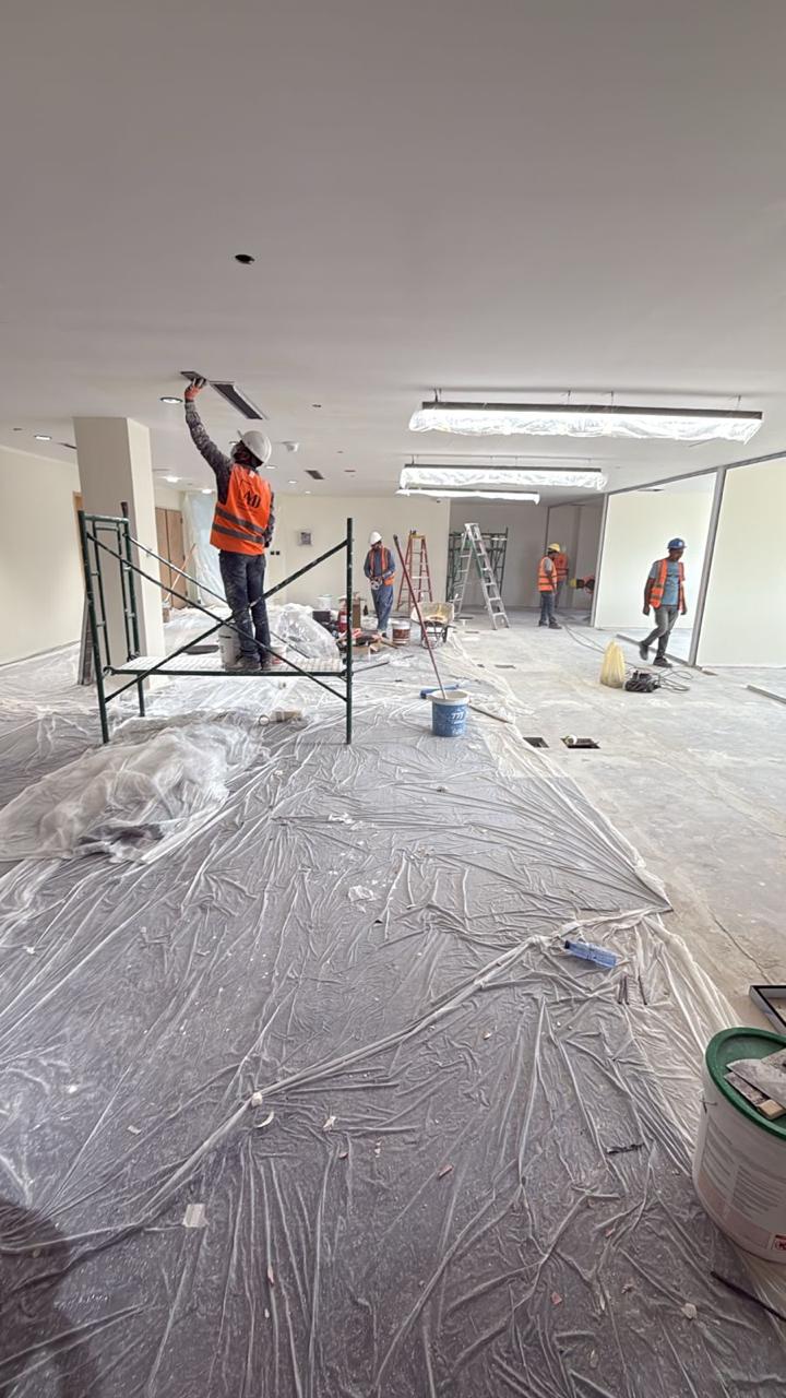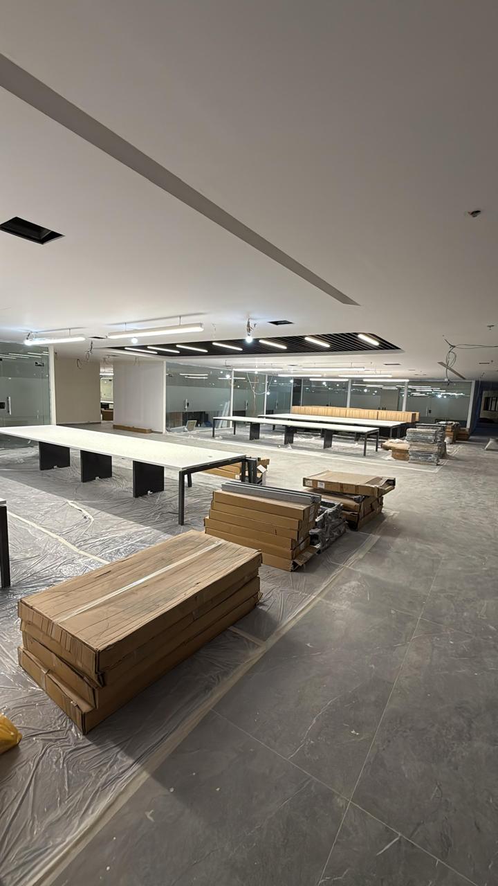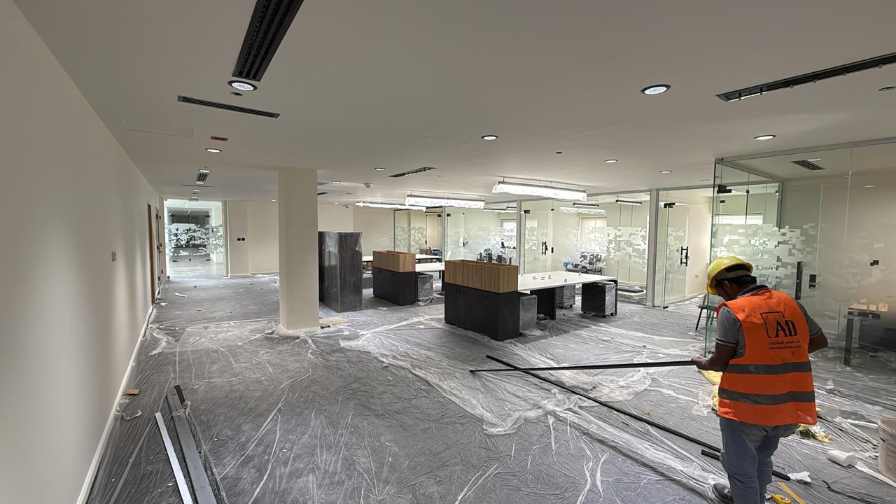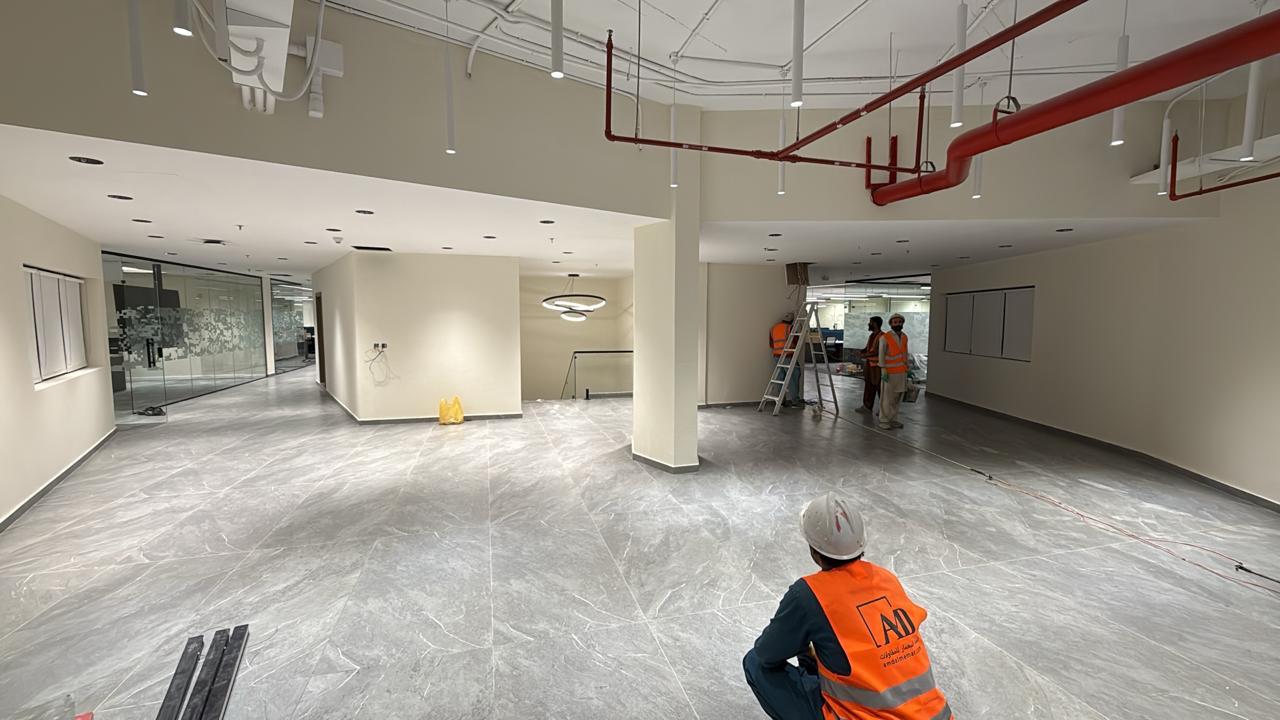 المساحه 2800 متر مربع المده 60 يوم إزالة أرضيات البلاط القديم وتاسيس سباكه وكهرباء وعمل جبس بورد وتركيب دكتات التكييف وتركيب الفواصل وتوريد الاجهزه الالكترونيه والاثاث المكتبي بالكامل