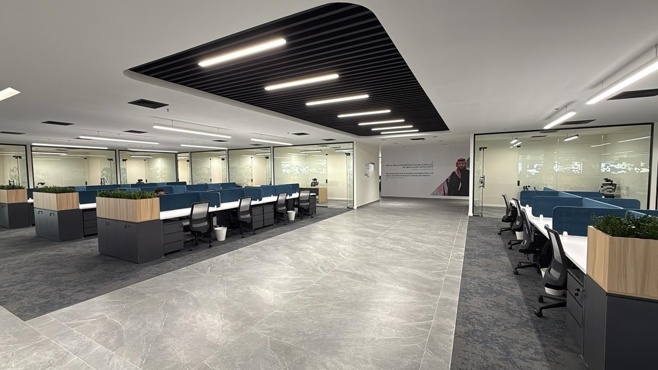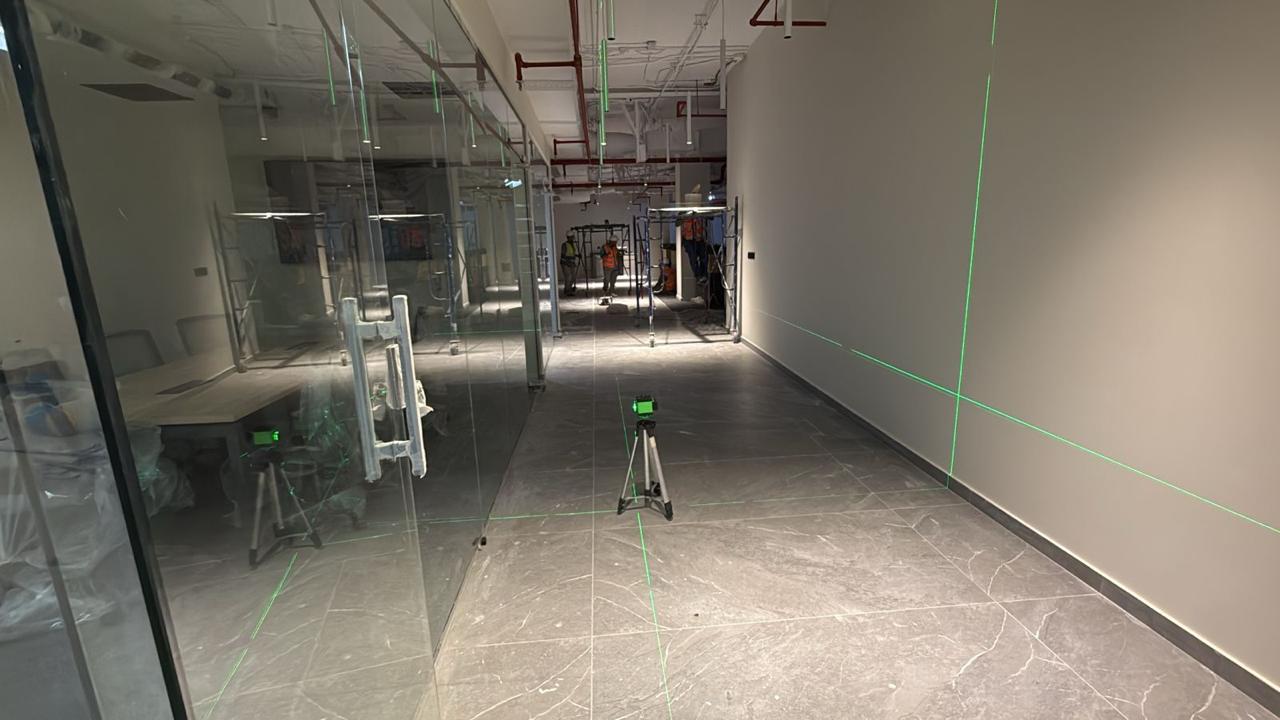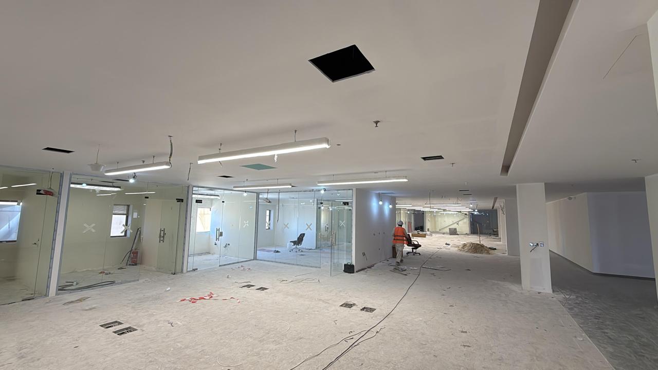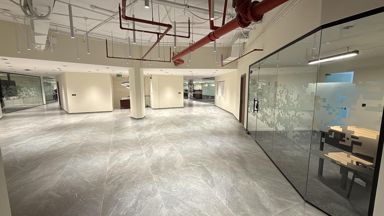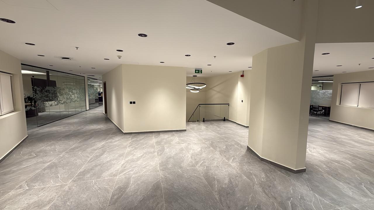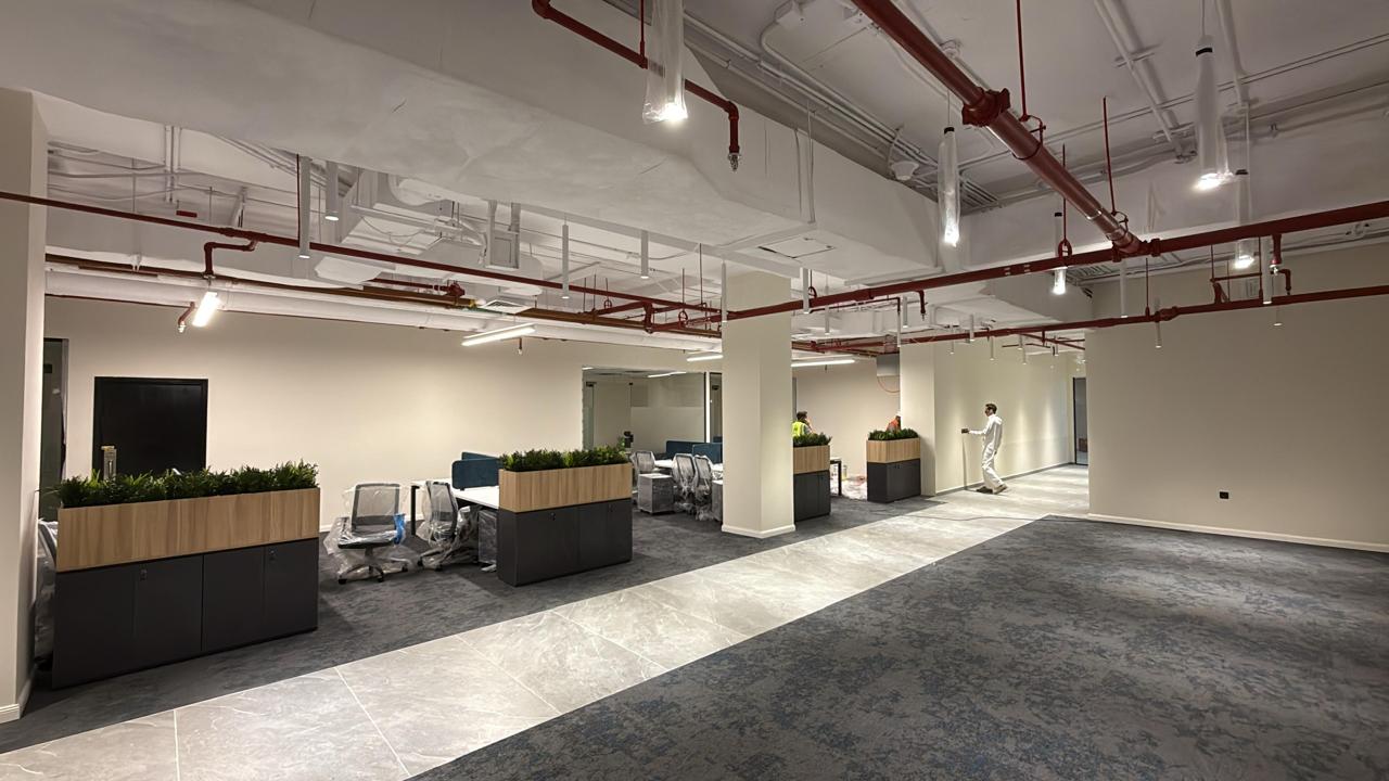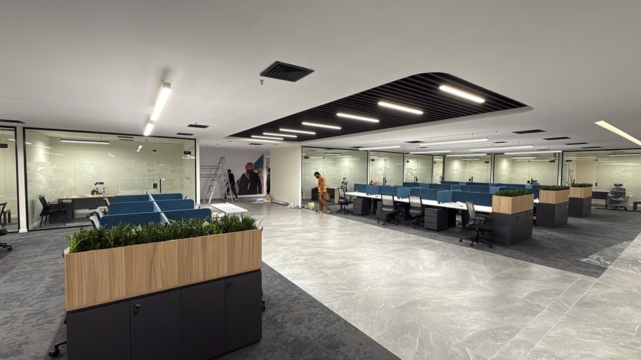 المساحه 2800 متر مربع المده 60 يوم إزالة أرضيات البلاط القديم وتاسيس سباكه وكهرباء وعمل جبس بورد وتركيب دكتات التكييف وتركيب الفواصل وتوريد الاجهزه الالكترونيه والاثاث المكتبي بالكامل