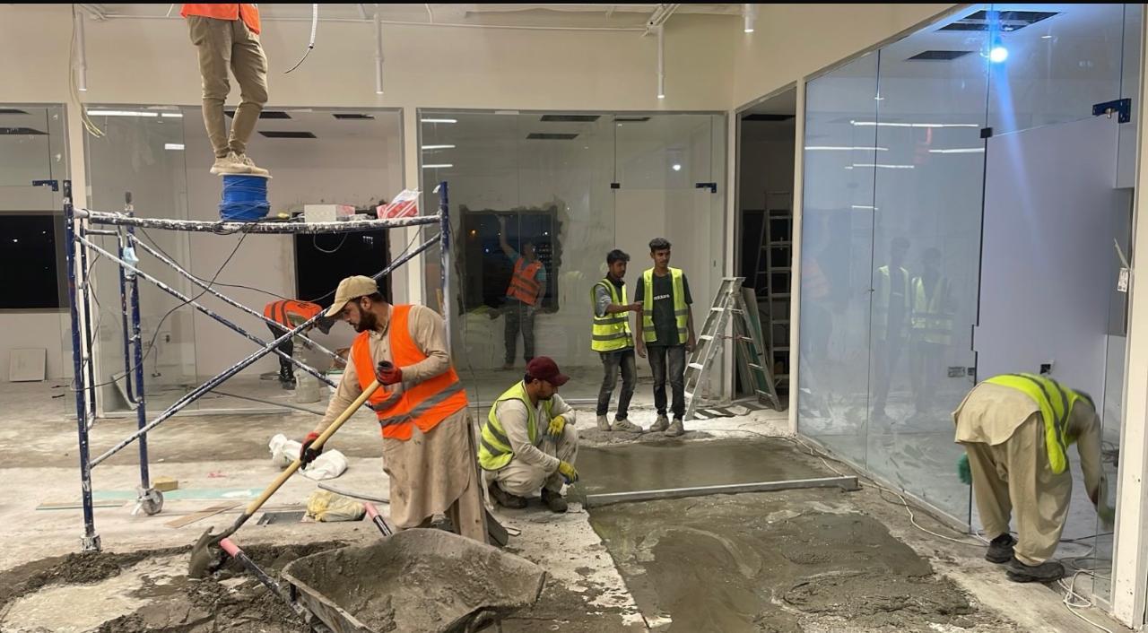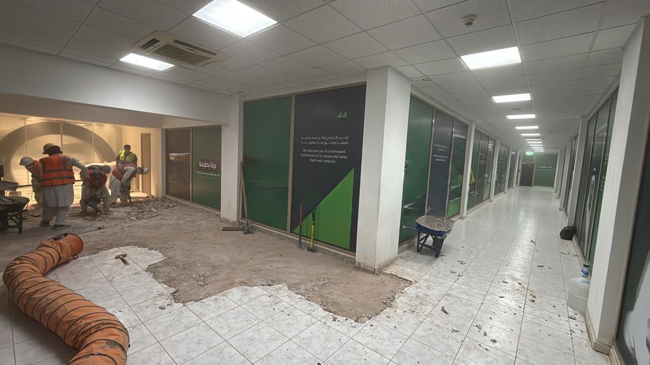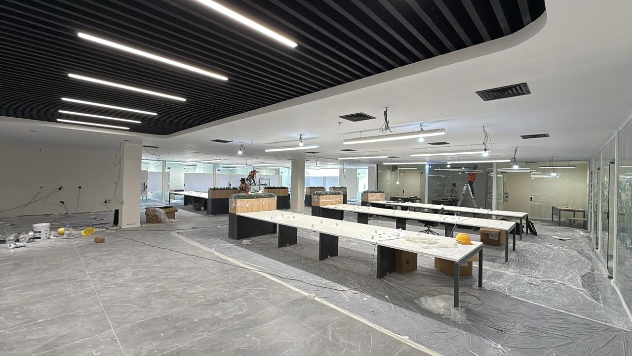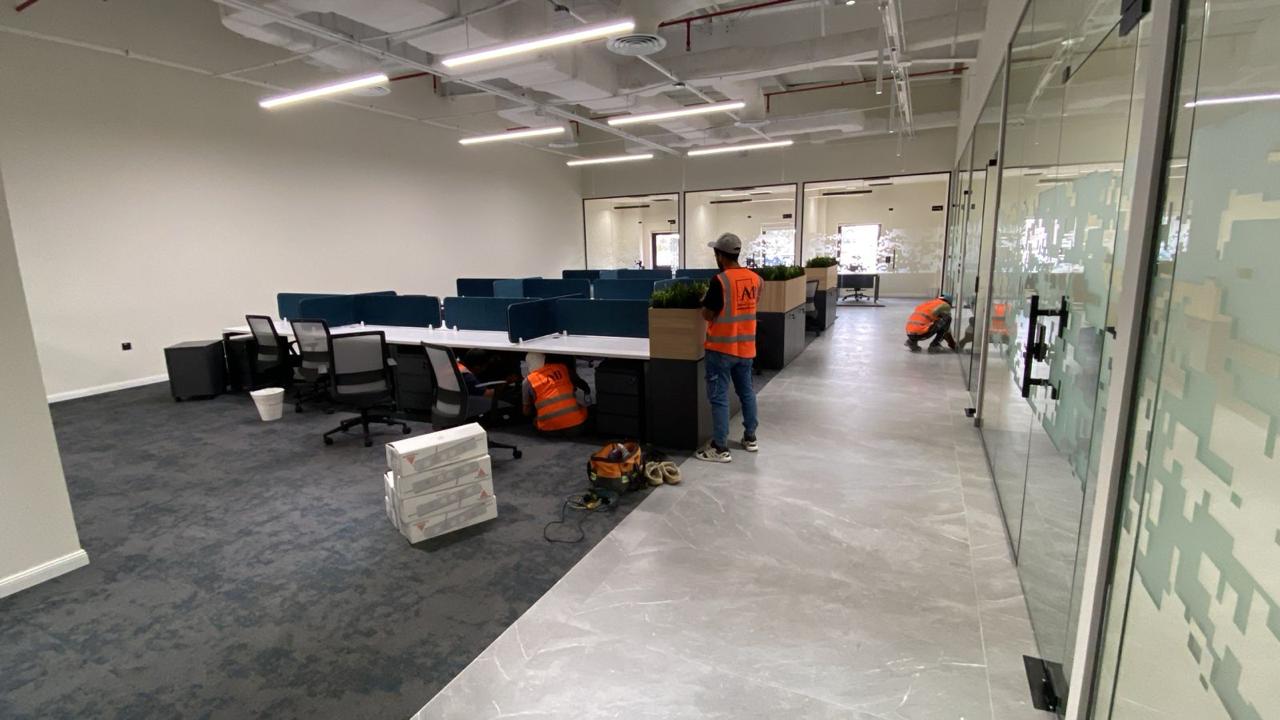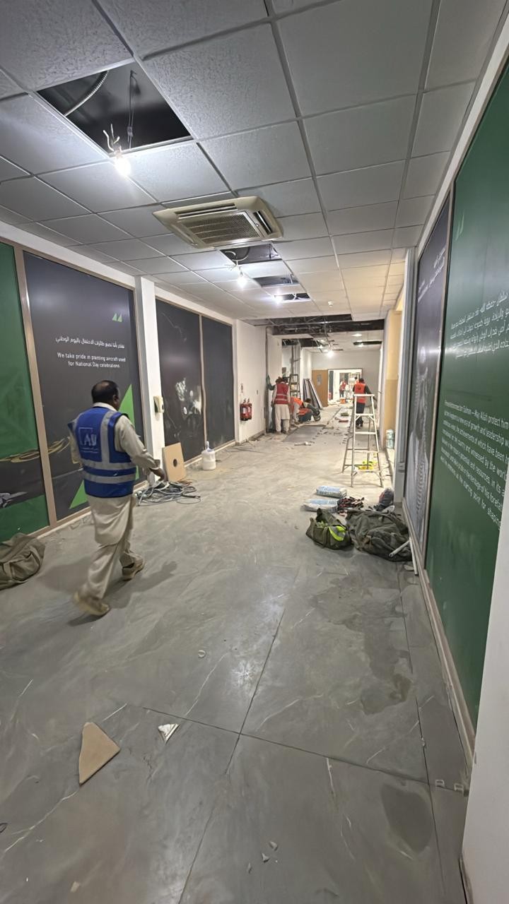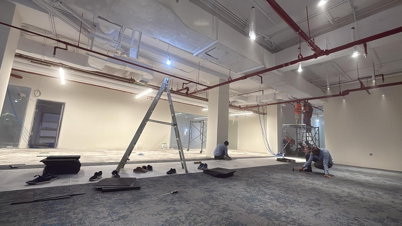 المساحه 2800 متر مربع المده 60 يوم إزالة أرضيات البلاط القديم وتاسيس سباكه وكهرباء وعمل جبس بورد وتركيب دكتات التكييف وتركيب الفواصل وتوريد الاجهزه الالكترونيه والاثاث المكتبي بالكامل