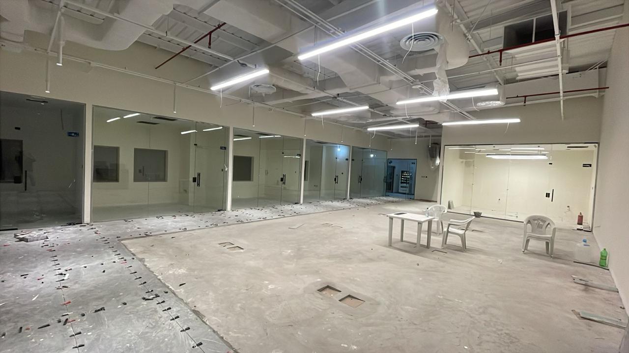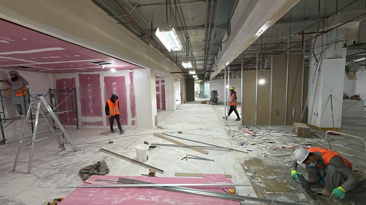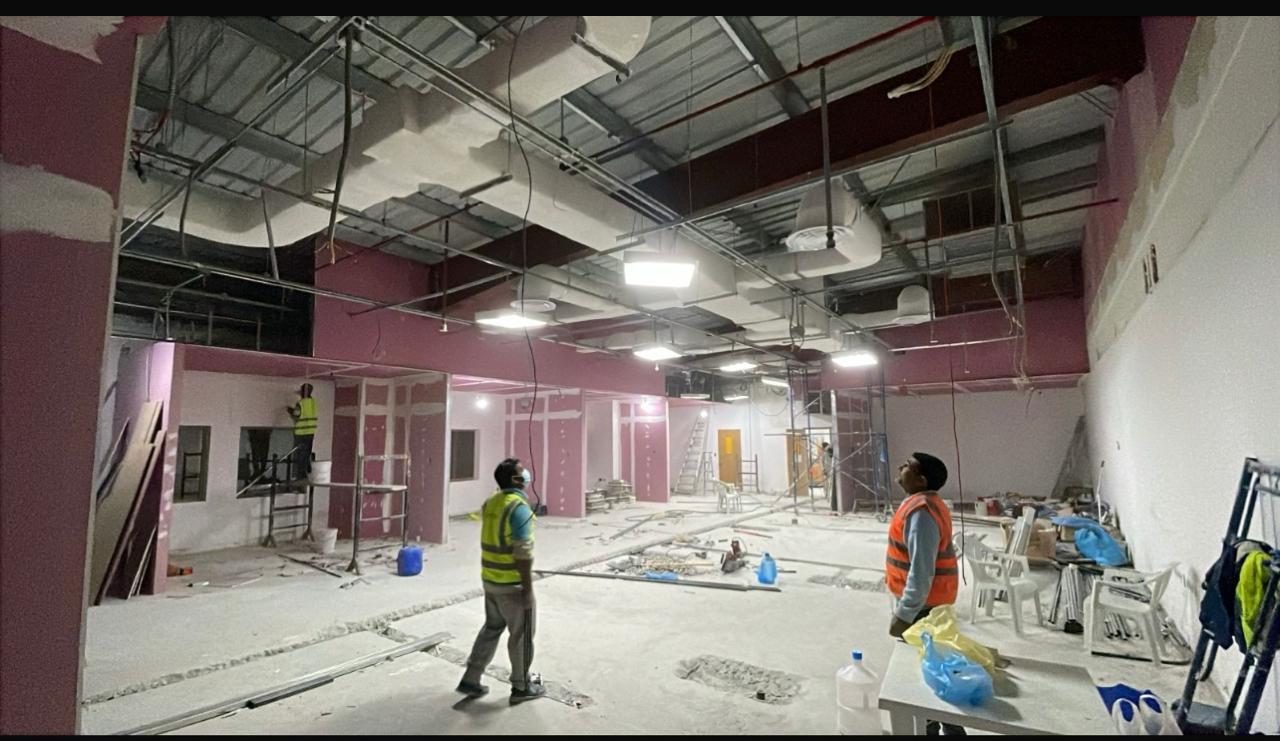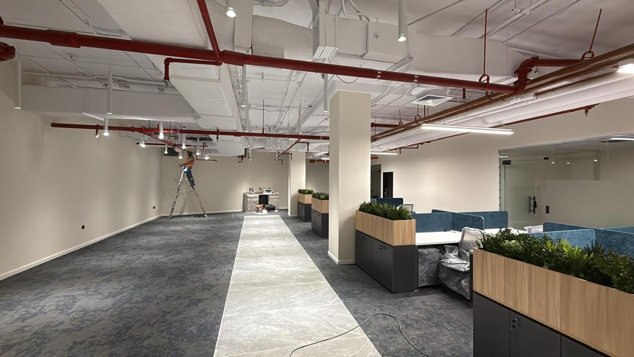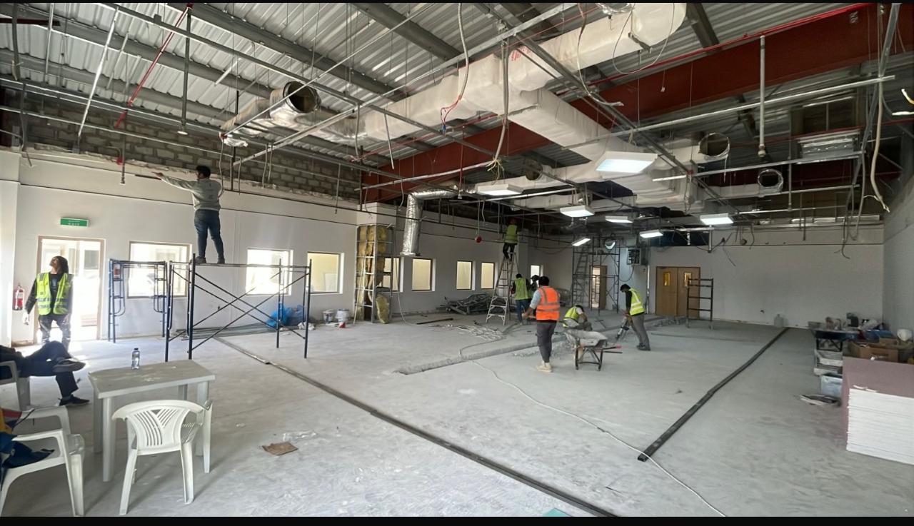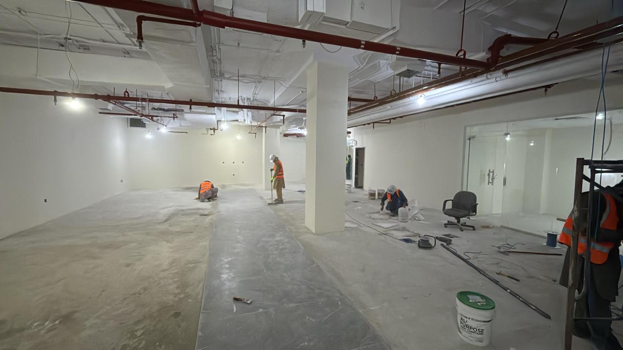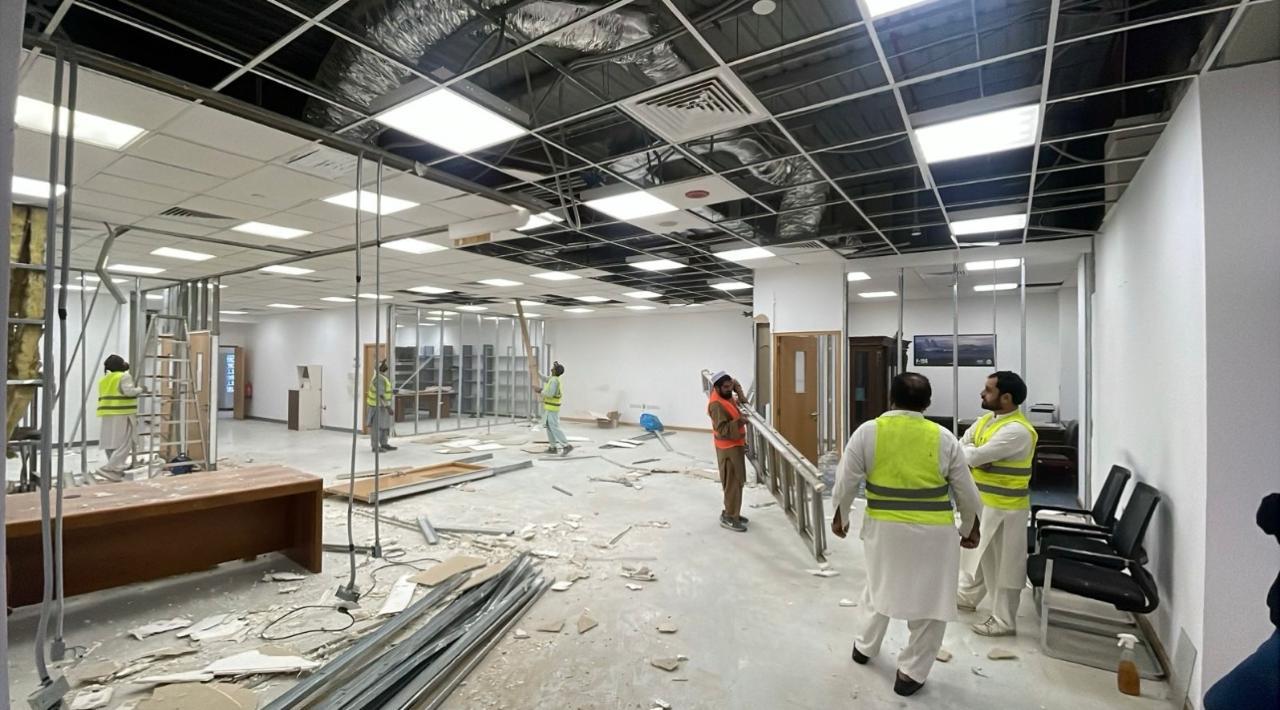 المساحه 2800 متر مربع المده 60 يوم إزالة أرضيات البلاط القديم وتاسيس سباكه وكهرباء وعمل جبس بورد وتركيب دكتات التكييف وتركيب الفواصل وتوريد الاجهزه الالكترونيه والاثاث المكتبي بالكامل
