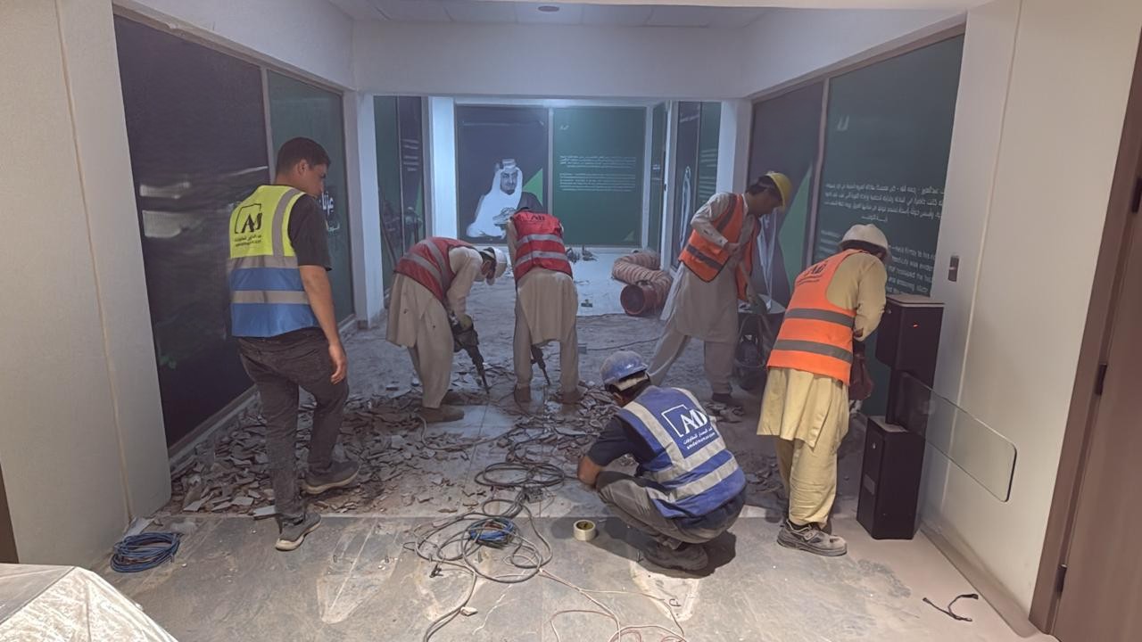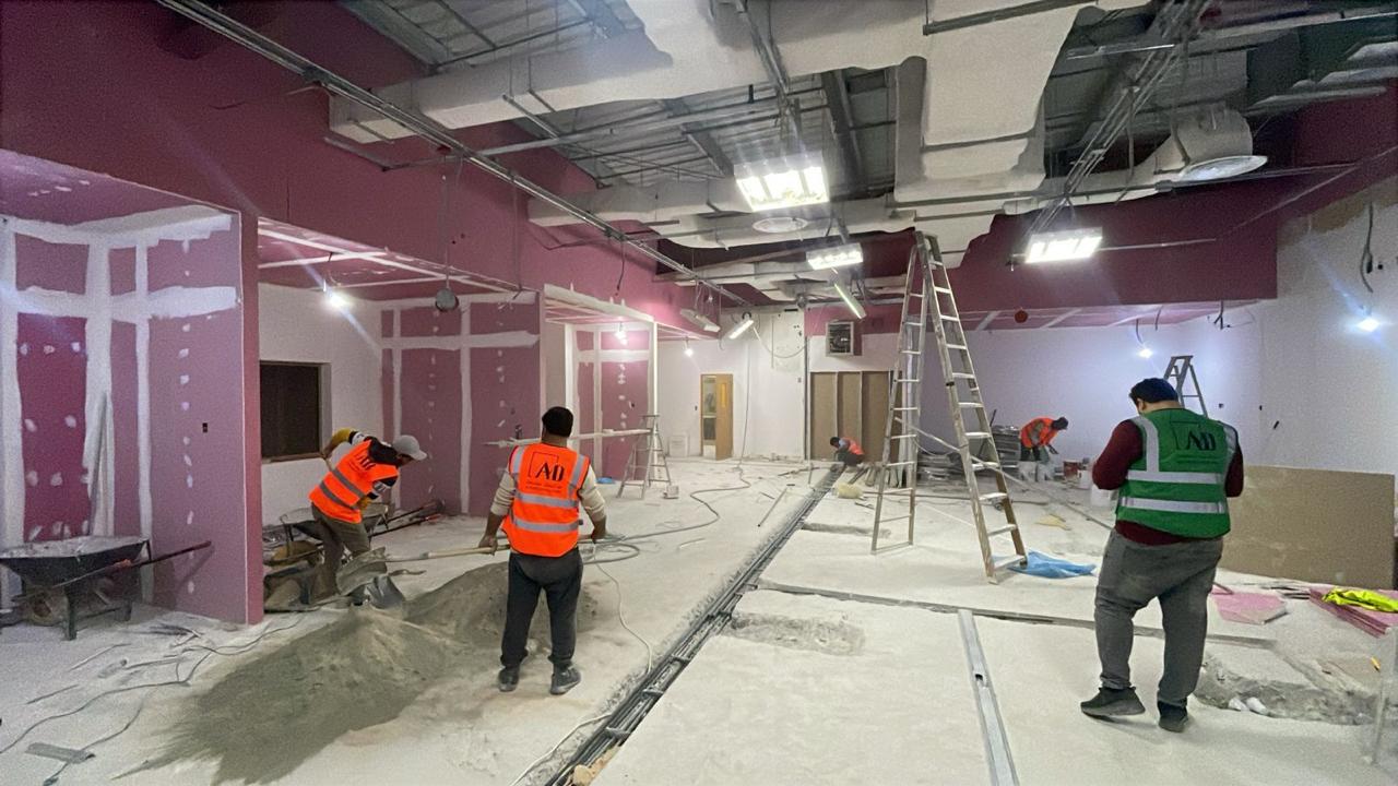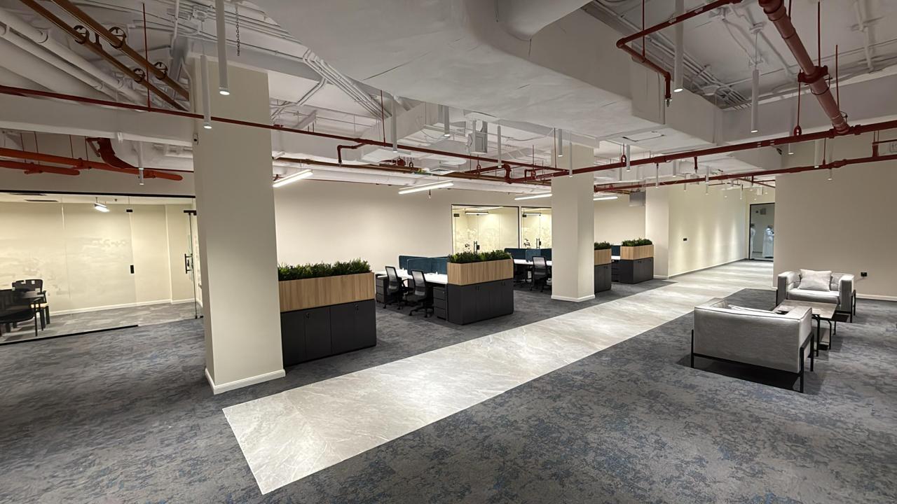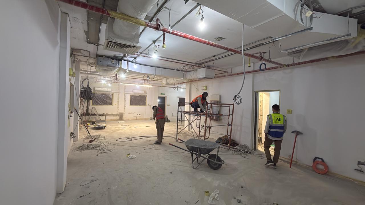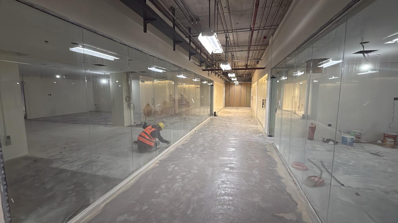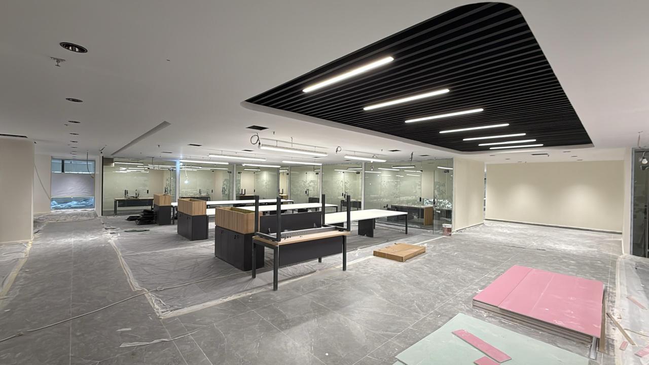 المساحه 2800 متر مربع المده 60 يوم إزالة أرضيات البلاط القديم وتاسيس سباكه وكهرباء وعمل جبس بورد وتركيب دكتات التكييف وتركيب الفواصل وتوريد الاجهزه الالكترونيه والاثاث المكتبي بالكامل