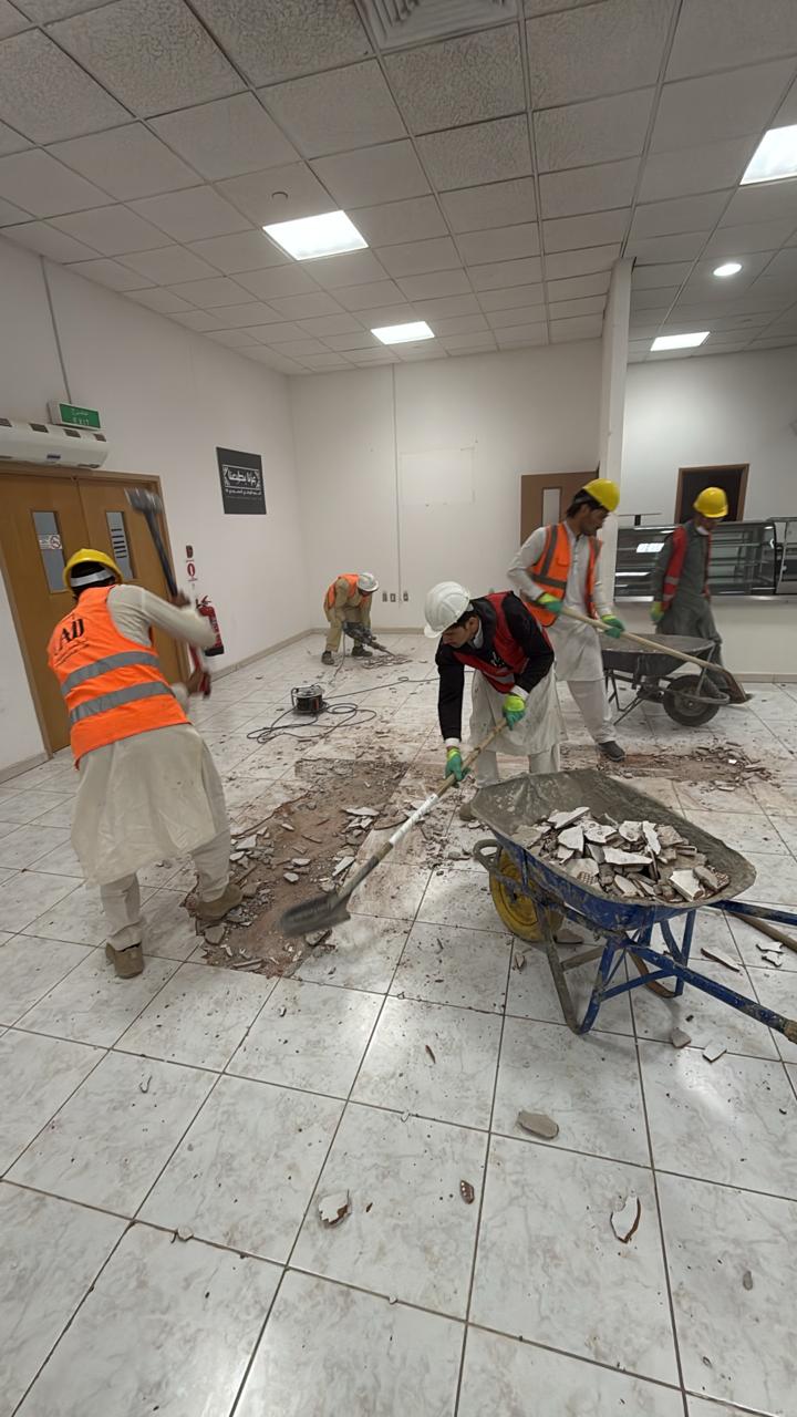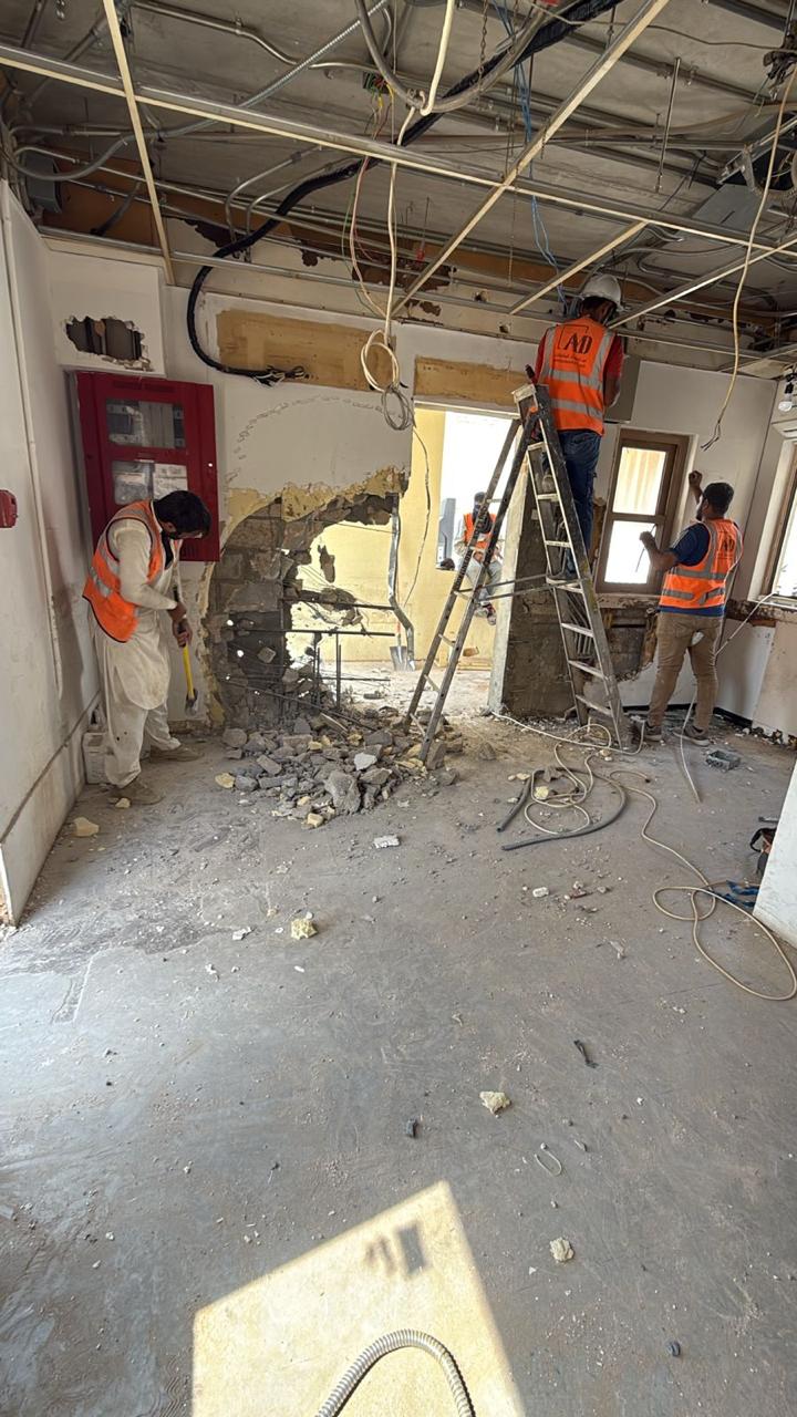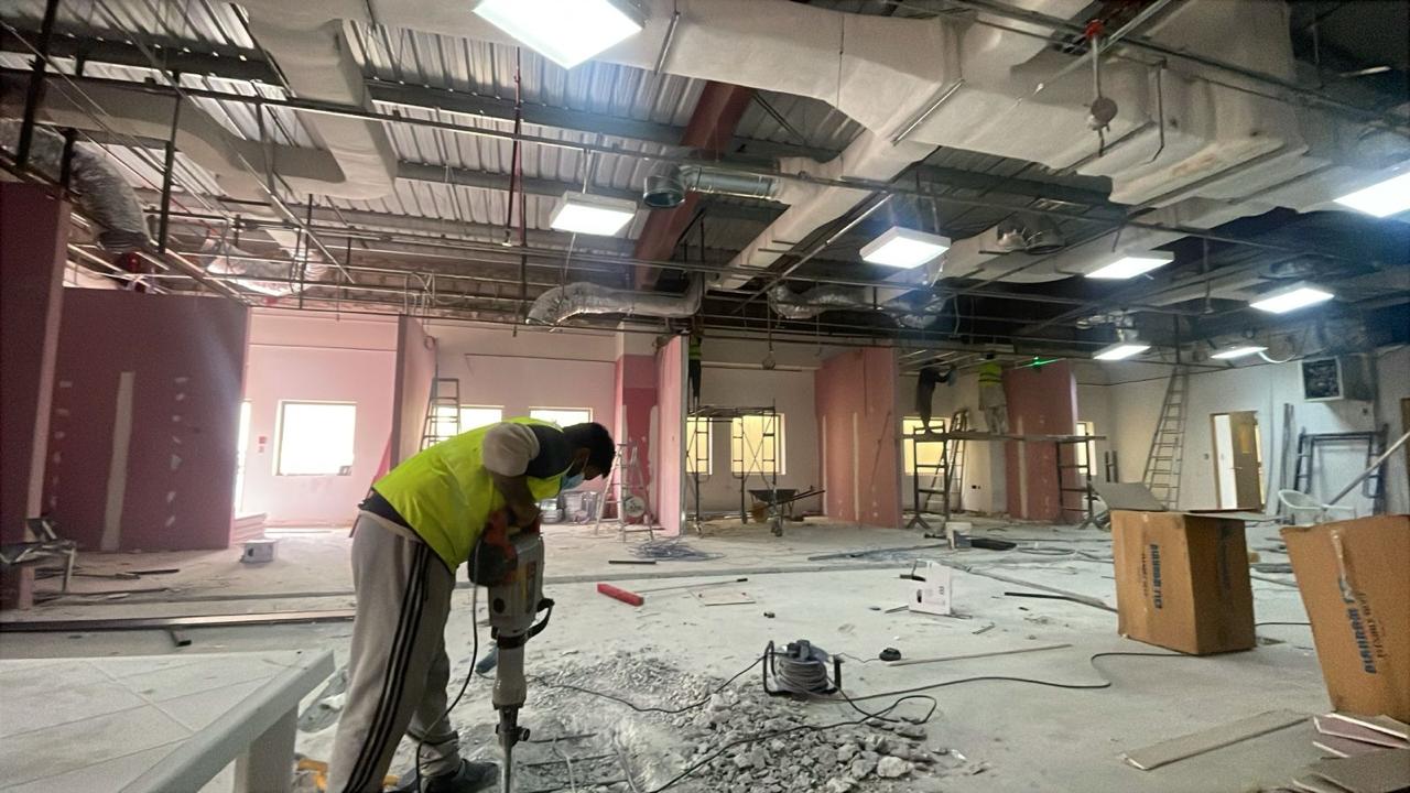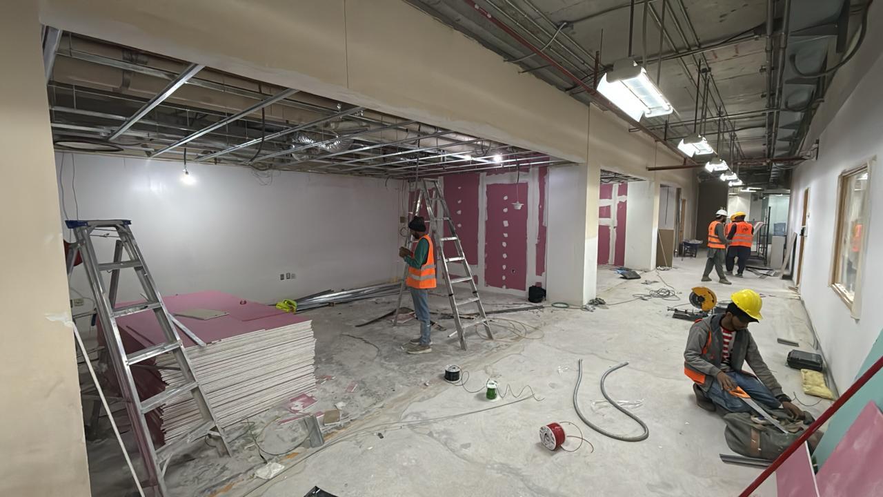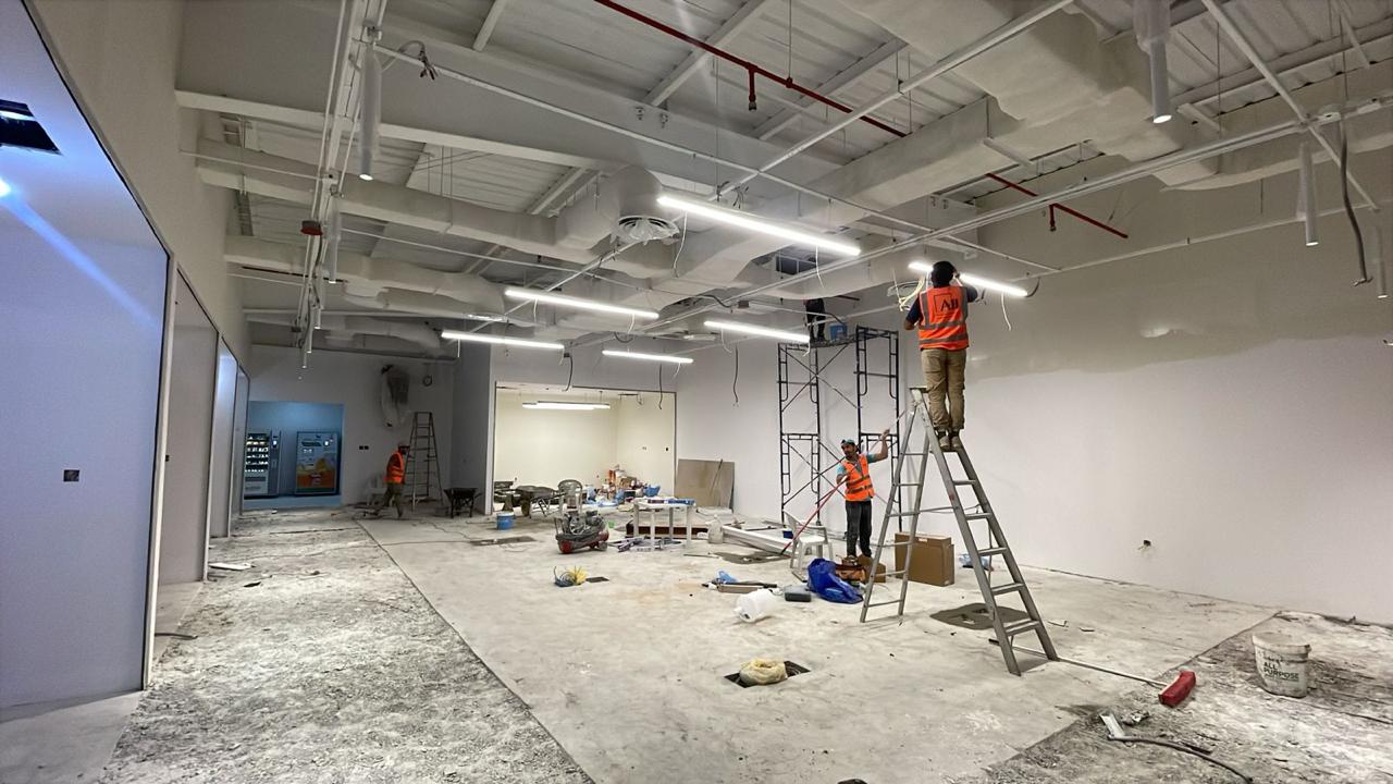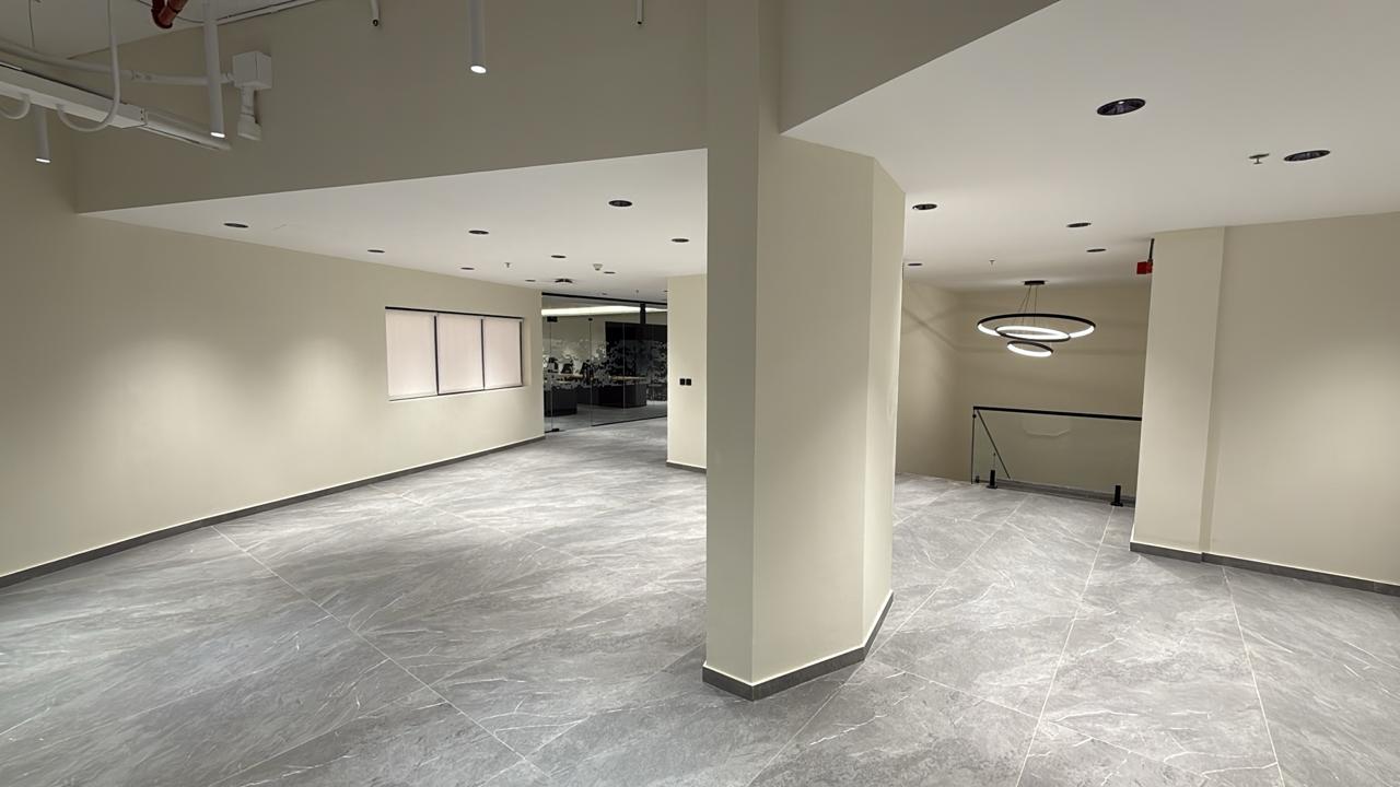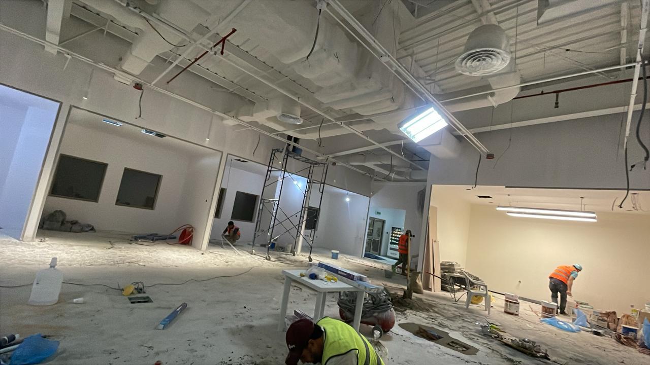 المساحه 2800 متر مربع المده 60 يوم إزالة أرضيات البلاط القديم وتاسيس سباكه وكهرباء وعمل جبس بورد وتركيب دكتات التكييف وتركيب الفواصل وتوريد الاجهزه الالكترونيه والاثاث المكتبي بالكامل