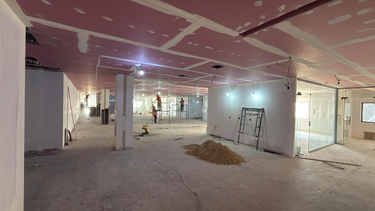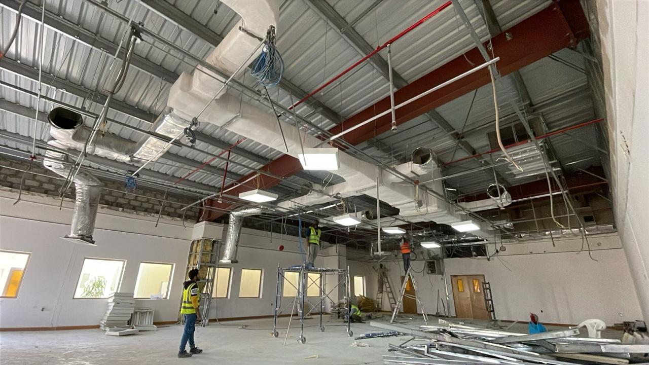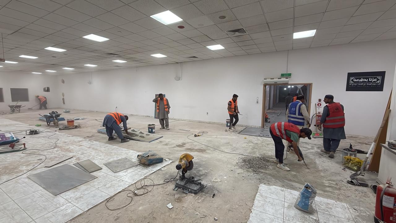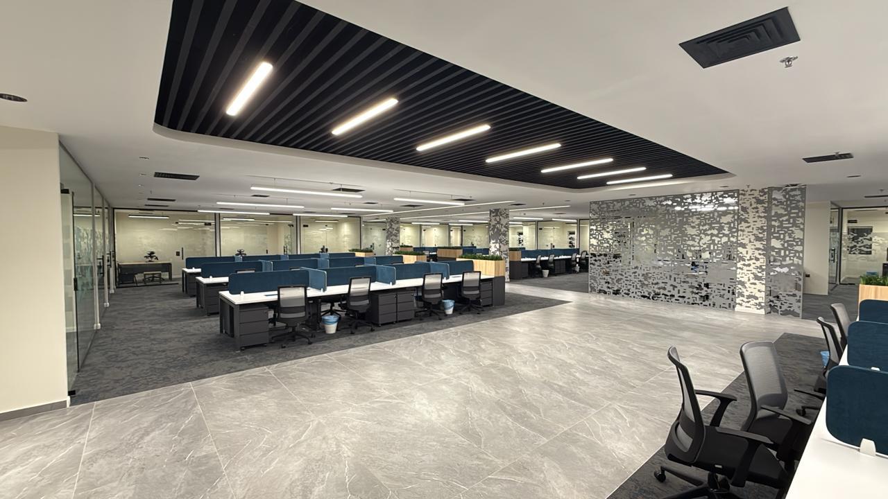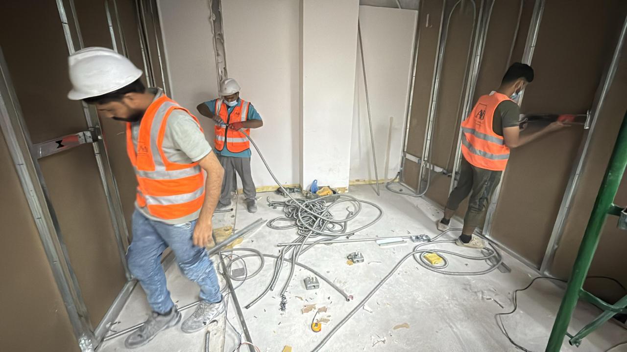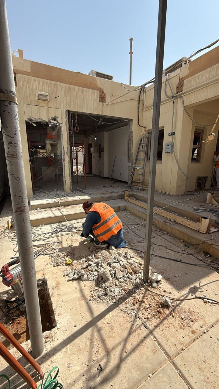 المساحه 2800 متر مربع المده 60 يوم إزالة أرضيات البلاط القديم وتاسيس سباكه وكهرباء وعمل جبس بورد وتركيب دكتات التكييف وتركيب الفواصل وتوريد الاجهزه الالكترونيه والاثاث المكتبي بالكامل