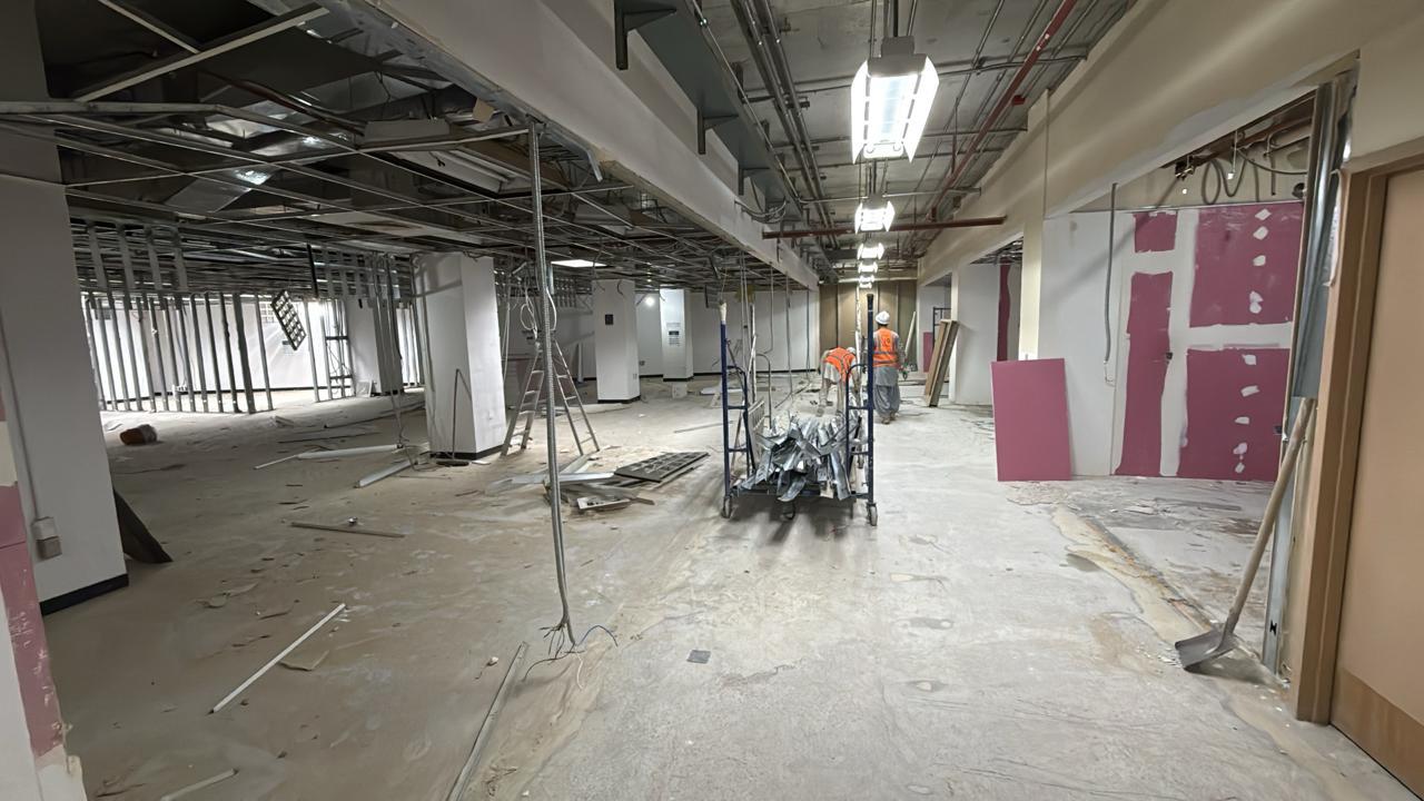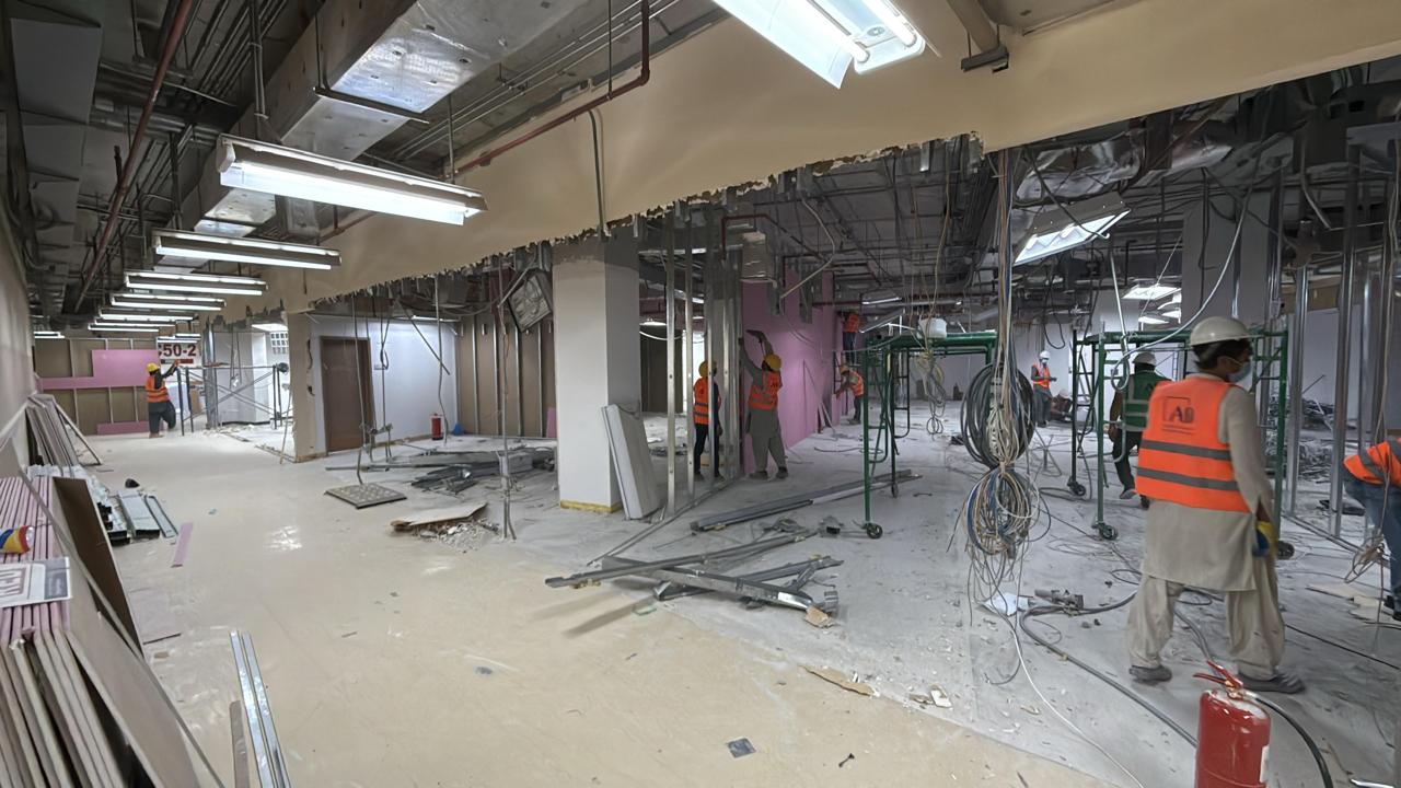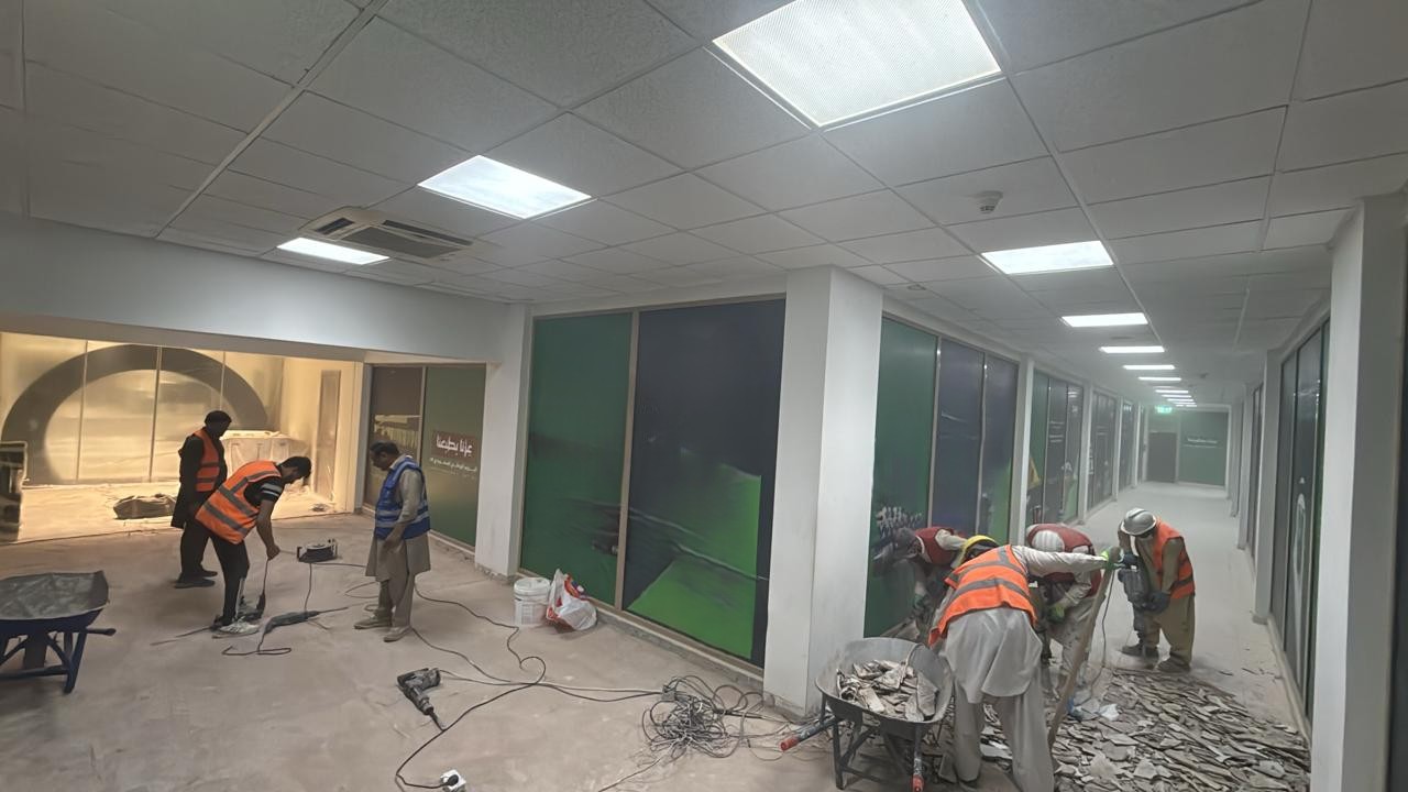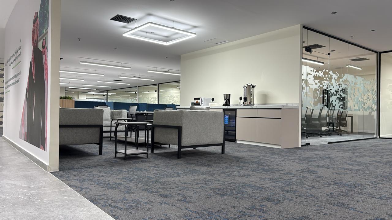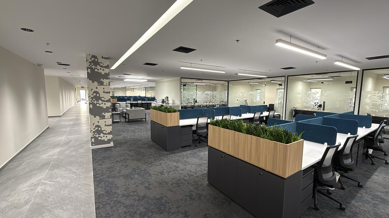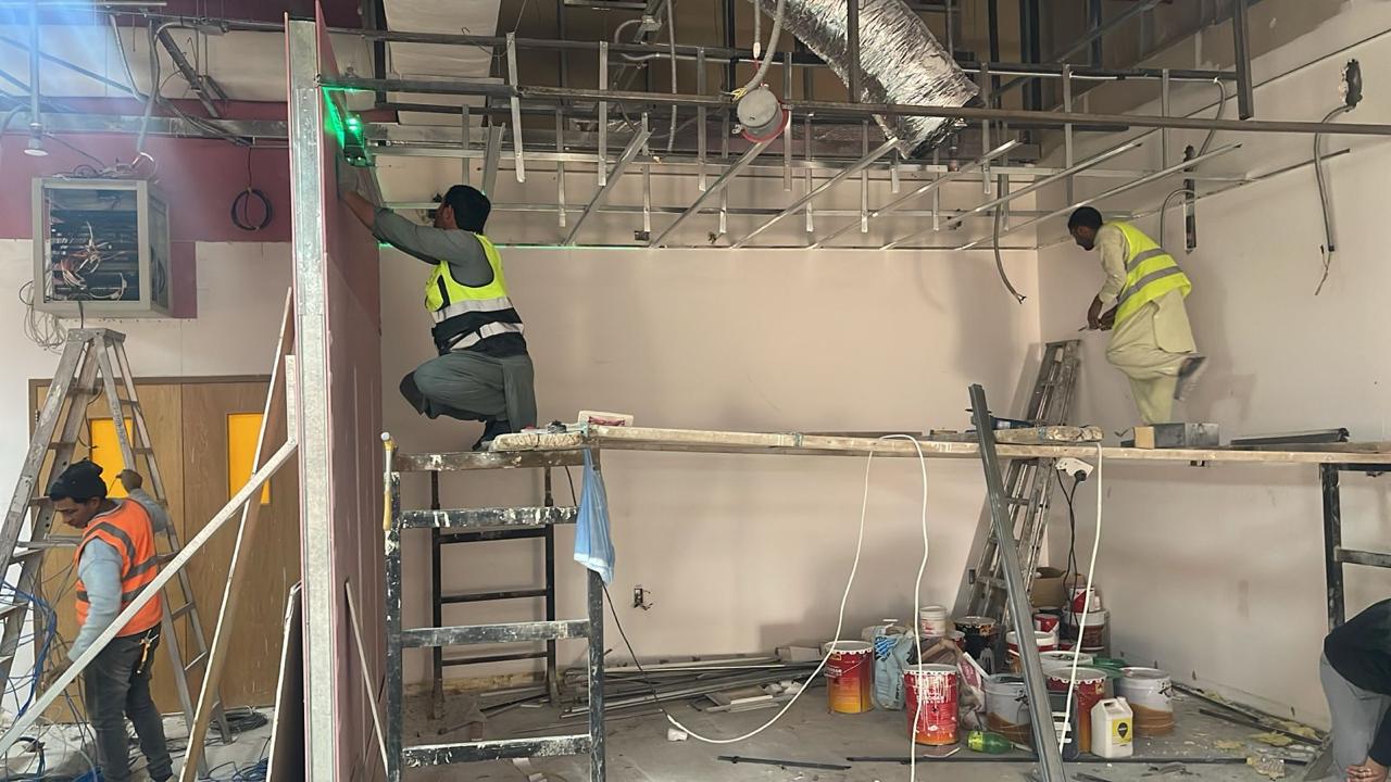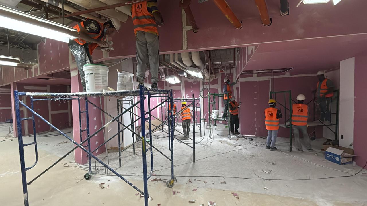 المساحه 2800 متر مربع المده 60 يوم إزالة أرضيات البلاط القديم وتاسيس سباكه وكهرباء وعمل جبس بورد وتركيب دكتات التكييف وتركيب الفواصل وتوريد الاجهزه الالكترونيه والاثاث المكتبي بالكامل