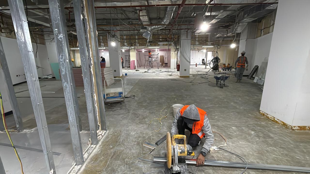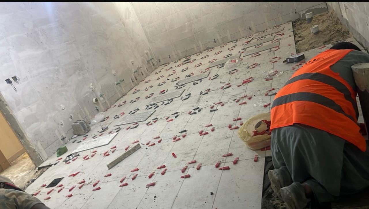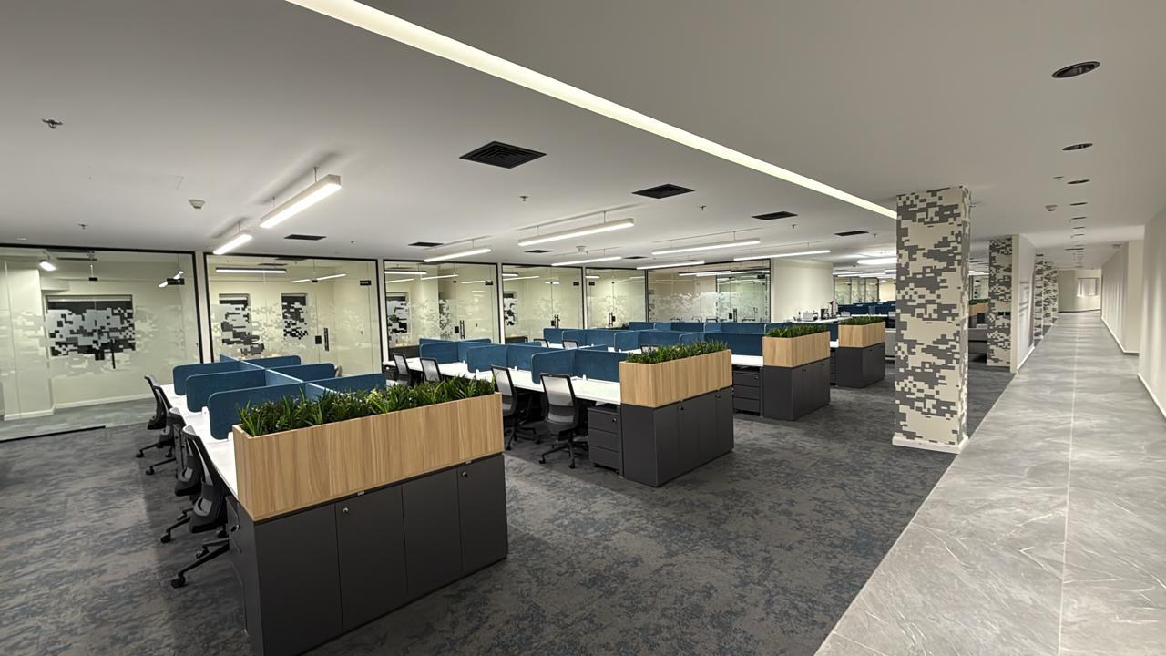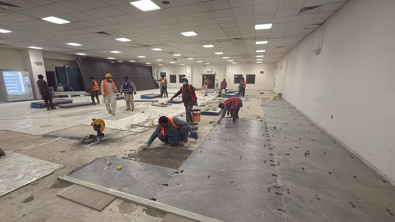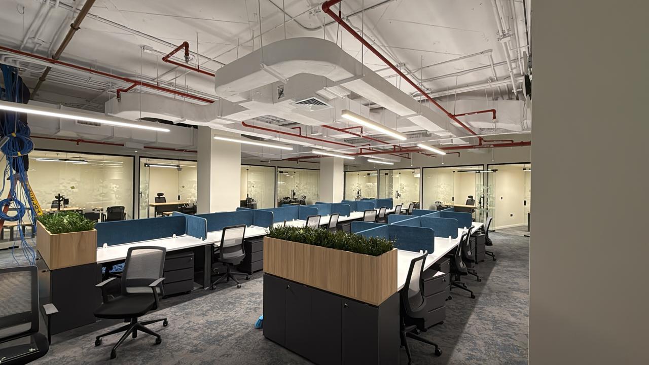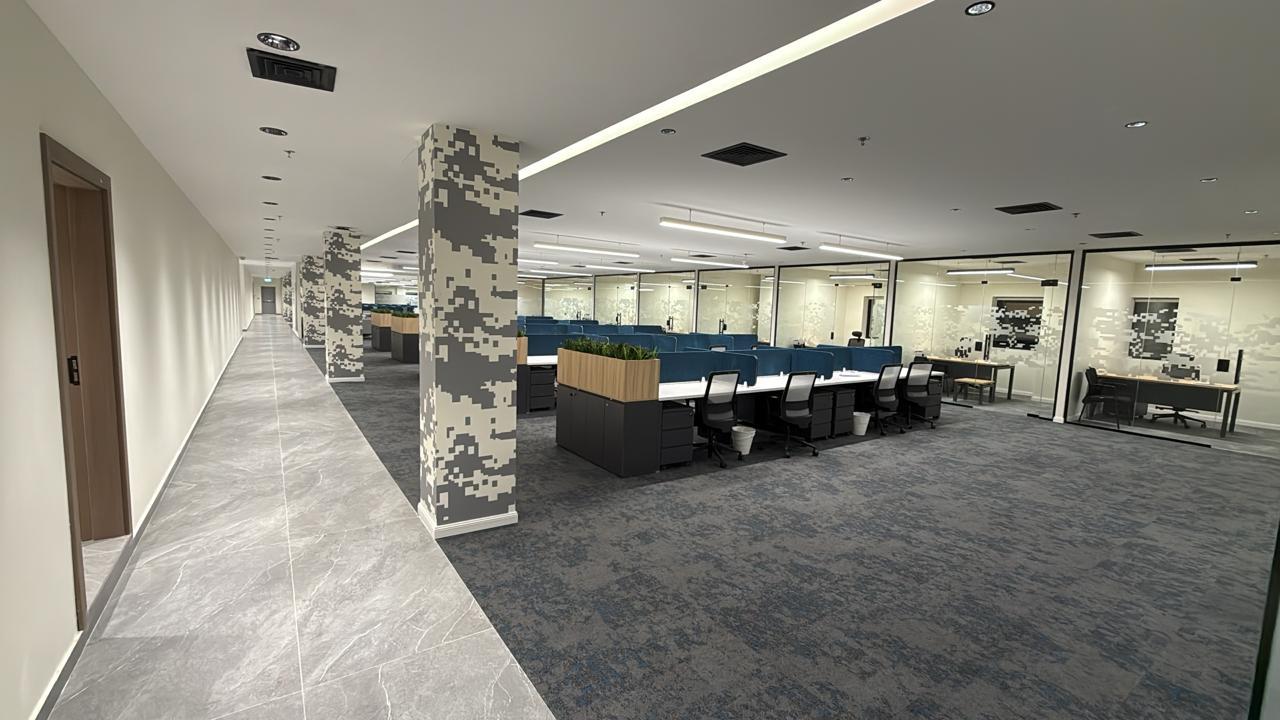 المساحه 2800 متر مربع المده 60 يوم إزالة أرضيات البلاط القديم وتاسيس سباكه وكهرباء وعمل جبس بورد وتركيب دكتات التكييف وتركيب الفواصل وتوريد الاجهزه الالكترونيه والاثاث المكتبي بالكامل