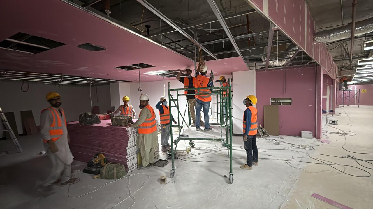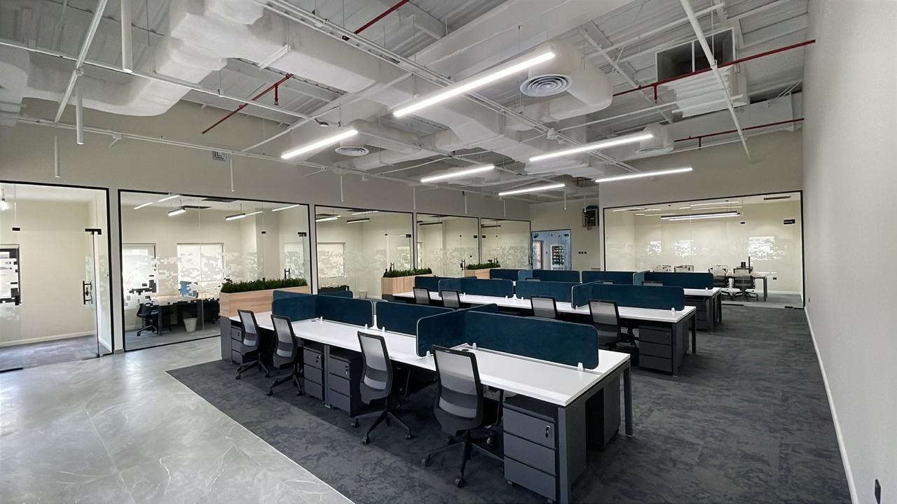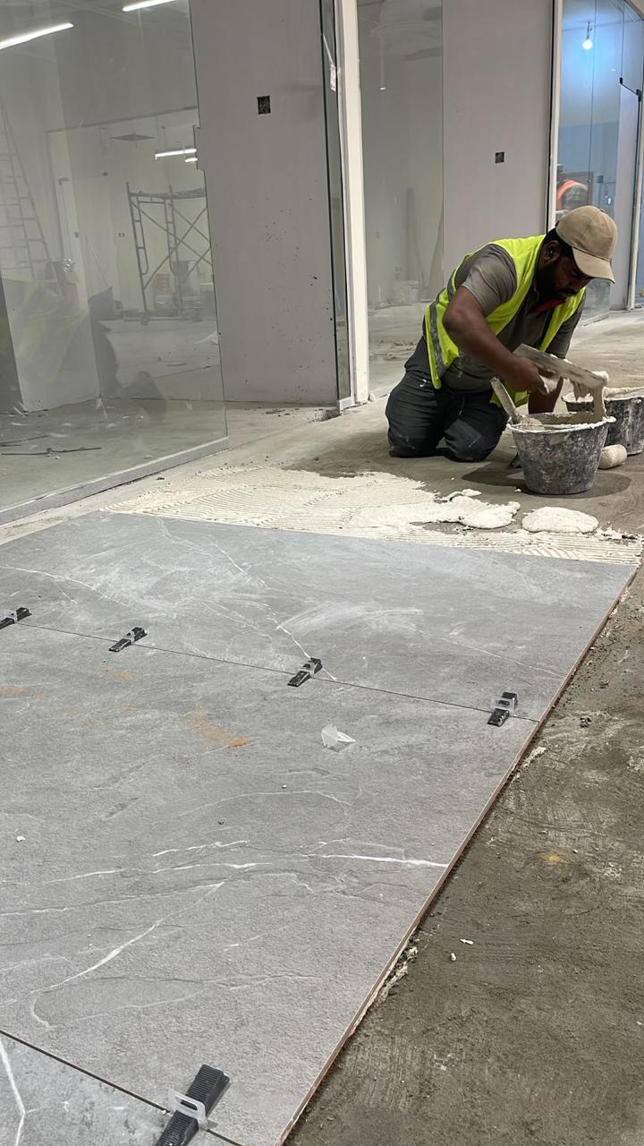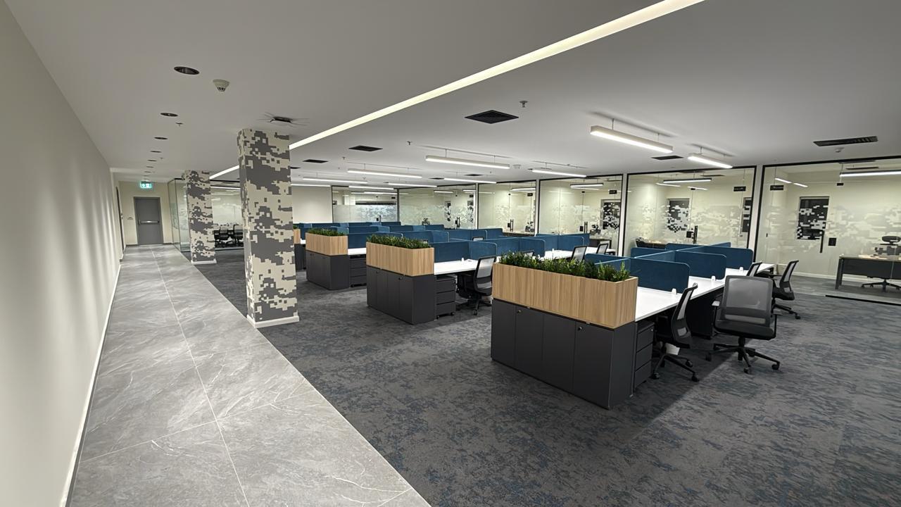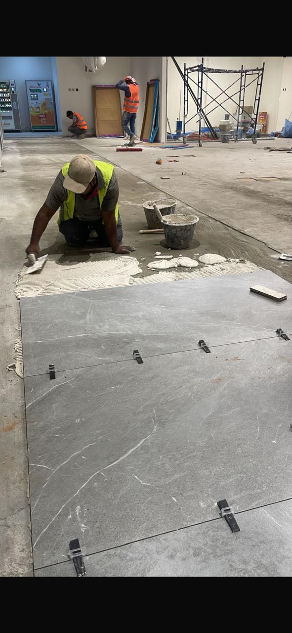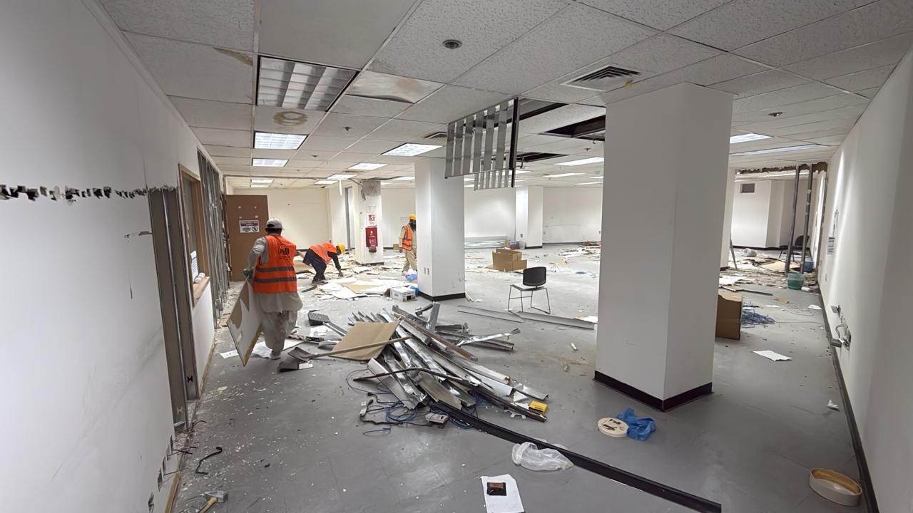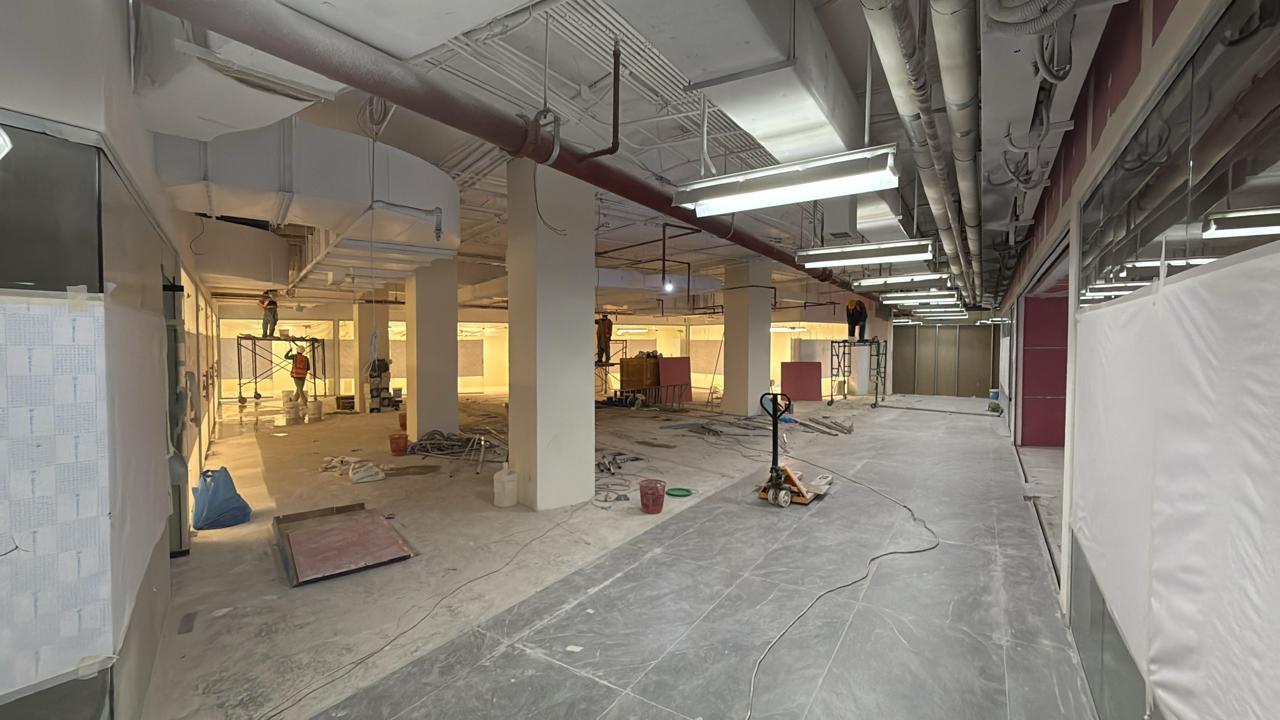 المساحه 2800 متر مربع المده 60 يوم إزالة أرضيات البلاط القديم وتاسيس سباكه وكهرباء وعمل جبس بورد وتركيب دكتات التكييف وتركيب الفواصل وتوريد الاجهزه الالكترونيه والاثاث المكتبي بالكامل