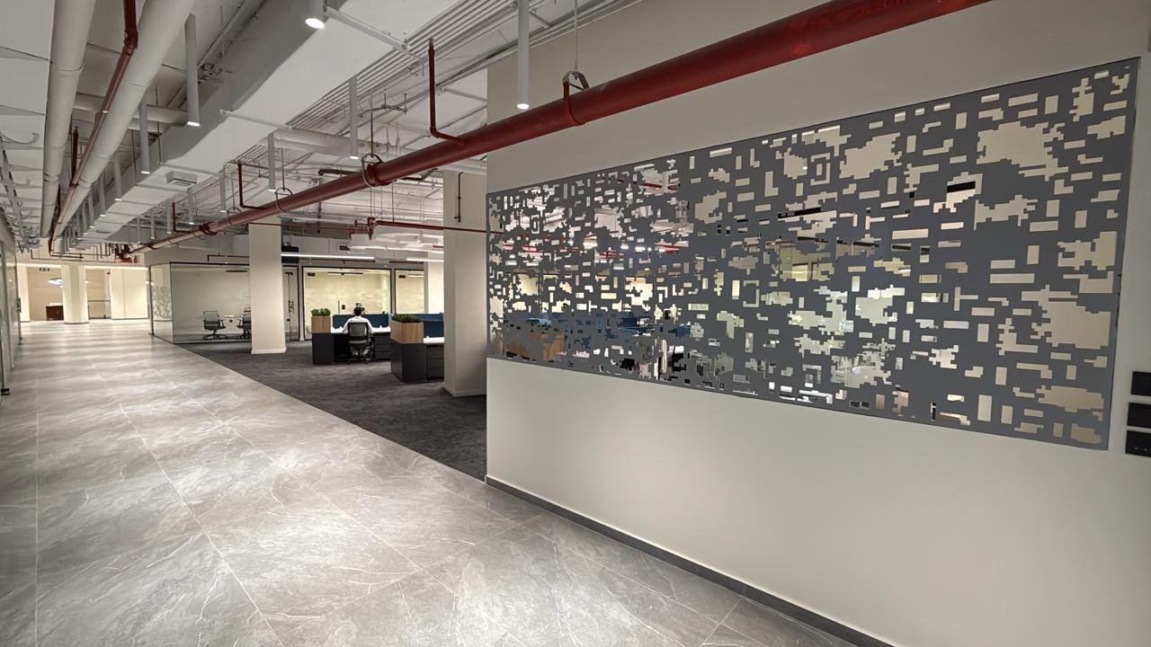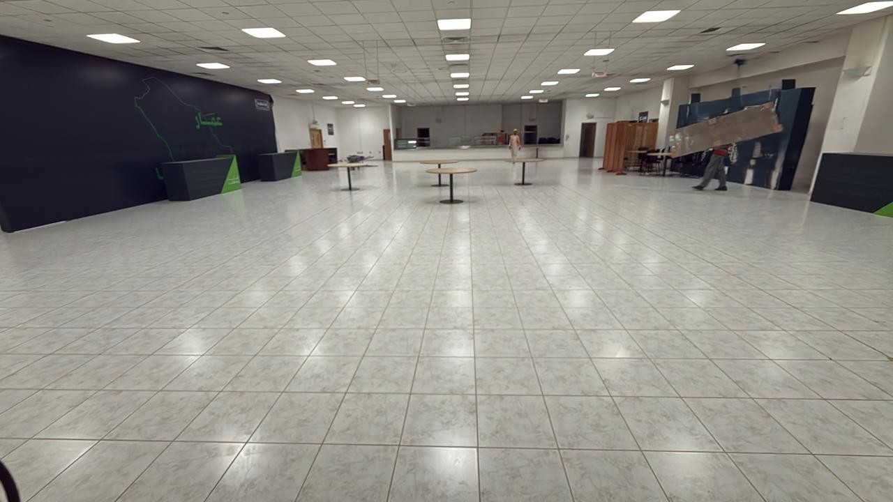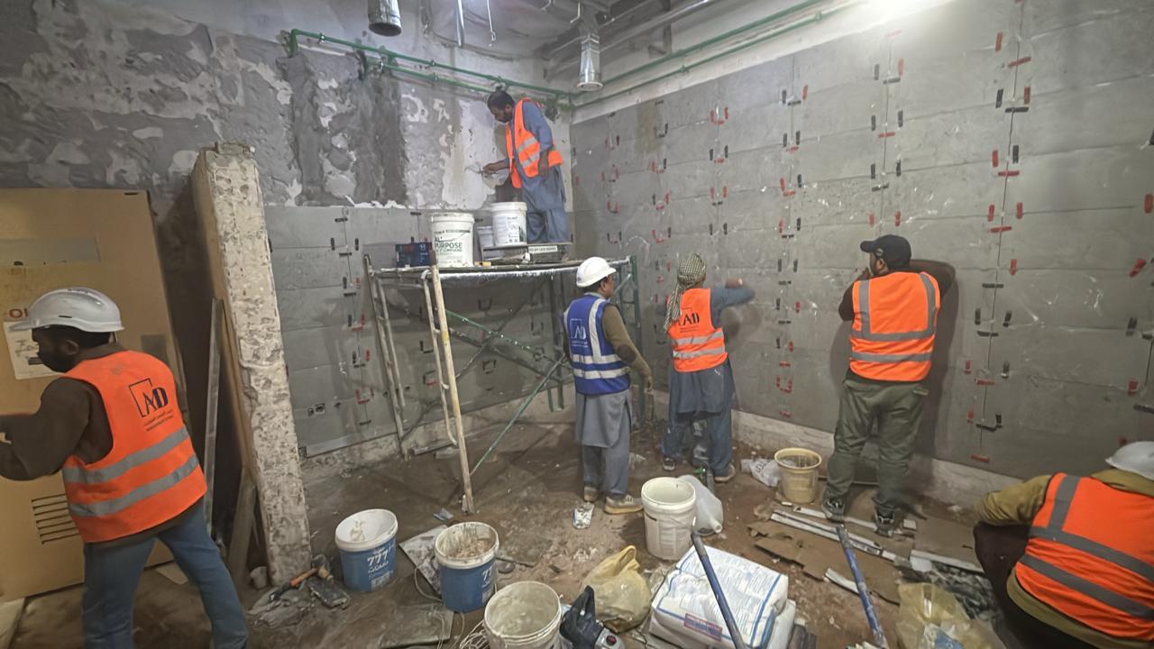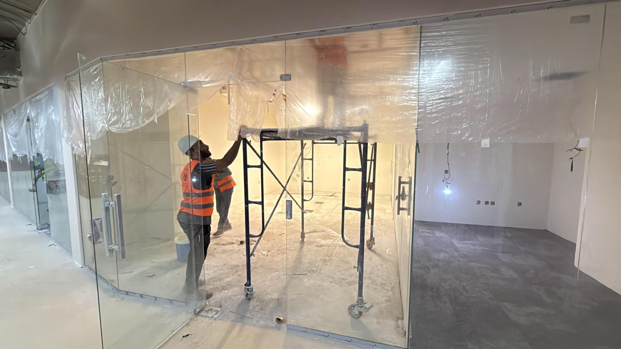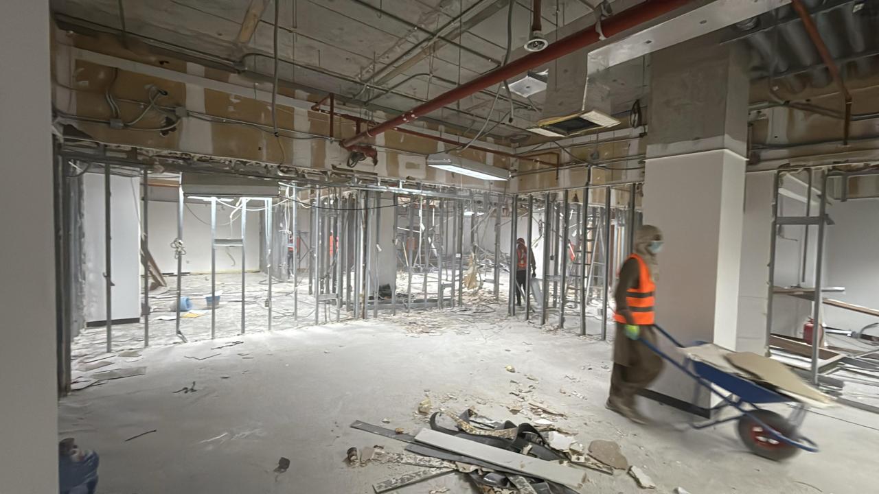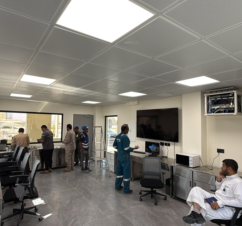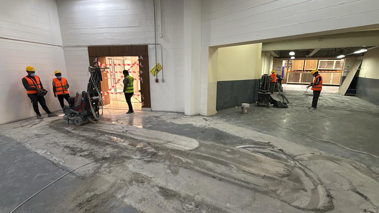 المساحه 2800 متر مربع المده 60 يوم إزالة أرضيات البلاط القديم وتاسيس سباكه وكهرباء وعمل جبس بورد وتركيب دكتات التكييف وتركيب الفواصل وتوريد الاجهزه الالكترونيه والاثاث المكتبي بالكامل