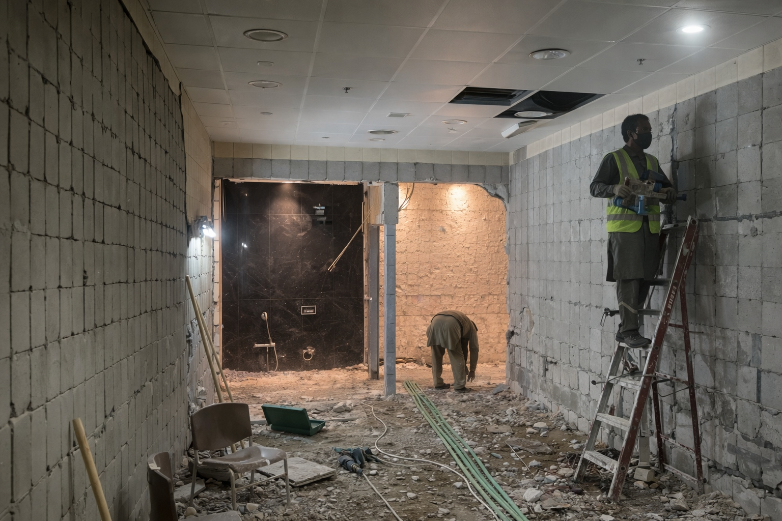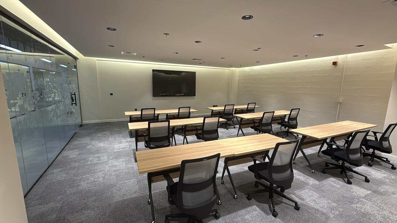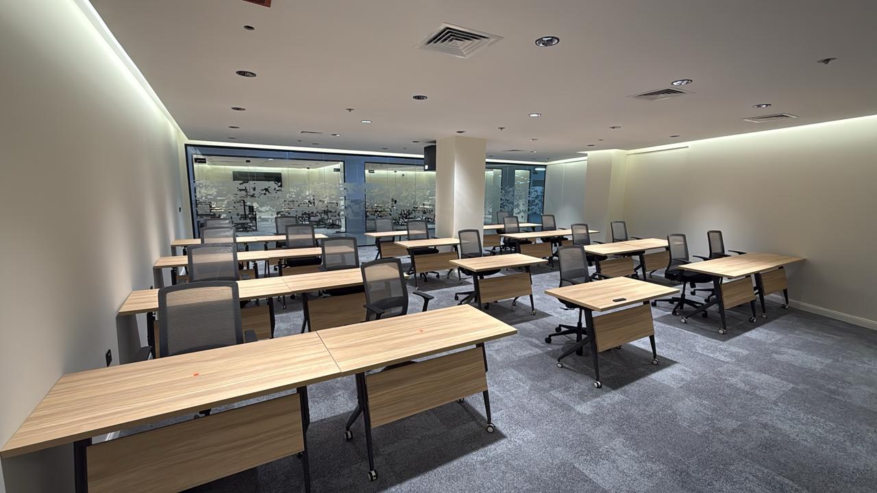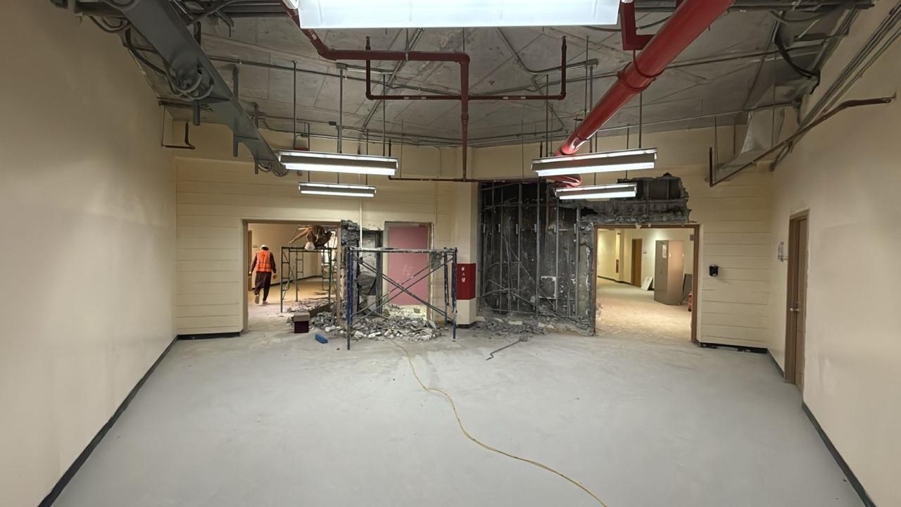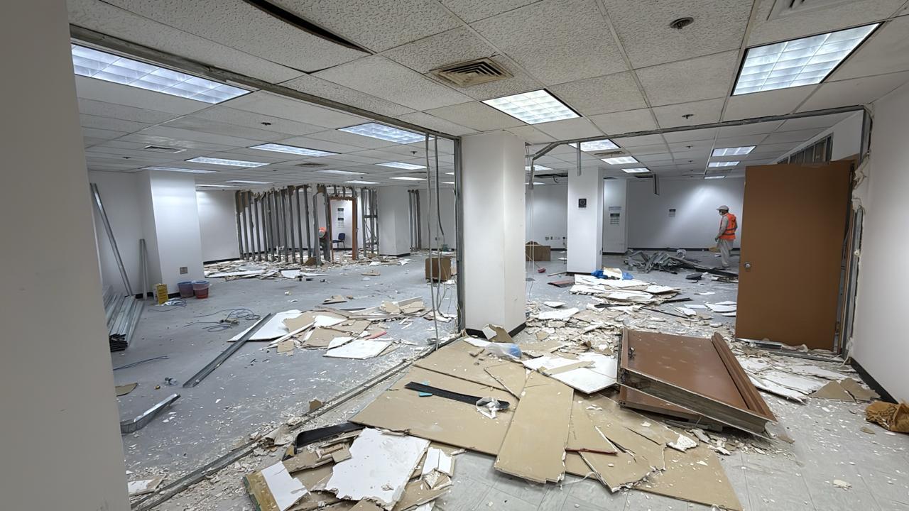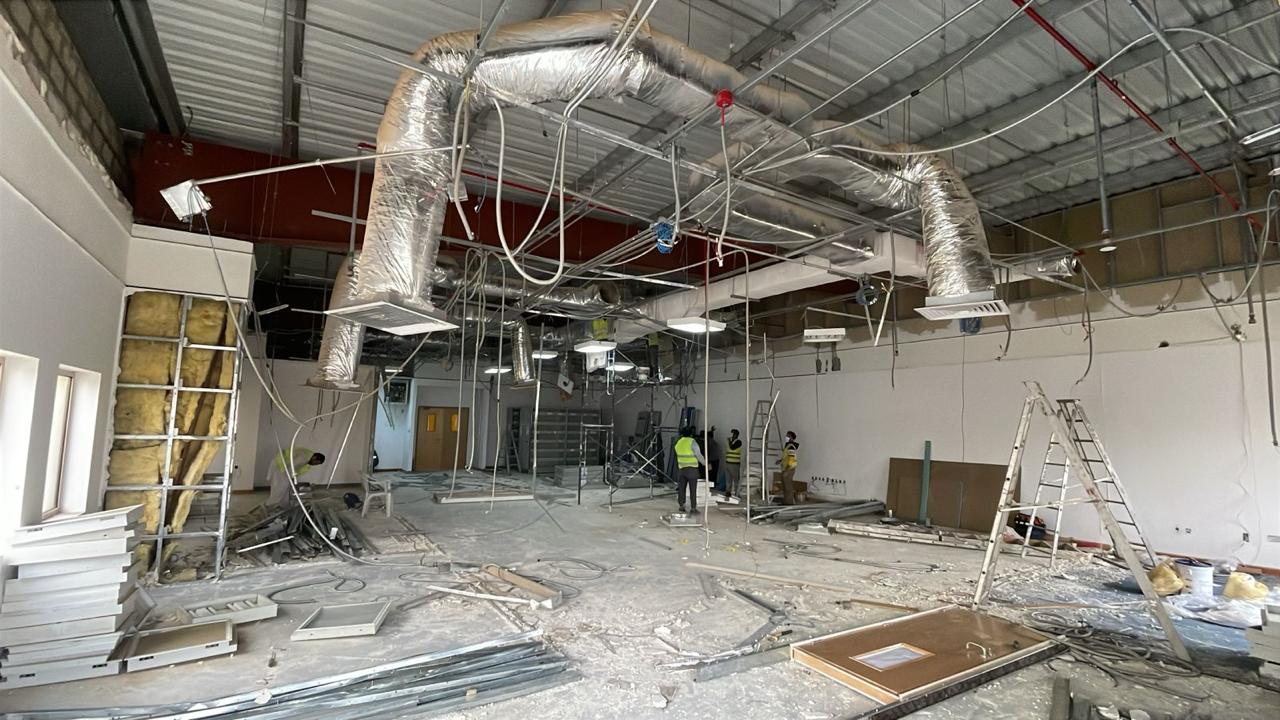 المساحه 2800 متر مربع المده 60 يوم إزالة أرضيات البلاط القديم وتاسيس سباكه وكهرباء وعمل جبس بورد وتركيب دكتات التكييف وتركيب الفواصل وتوريد الاجهزه الالكترونيه والاثاث المكتبي بالكامل