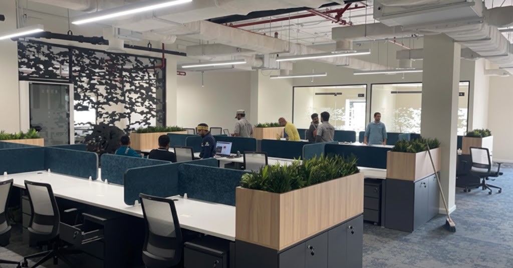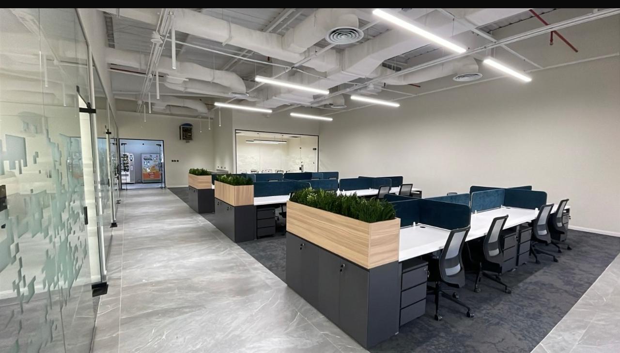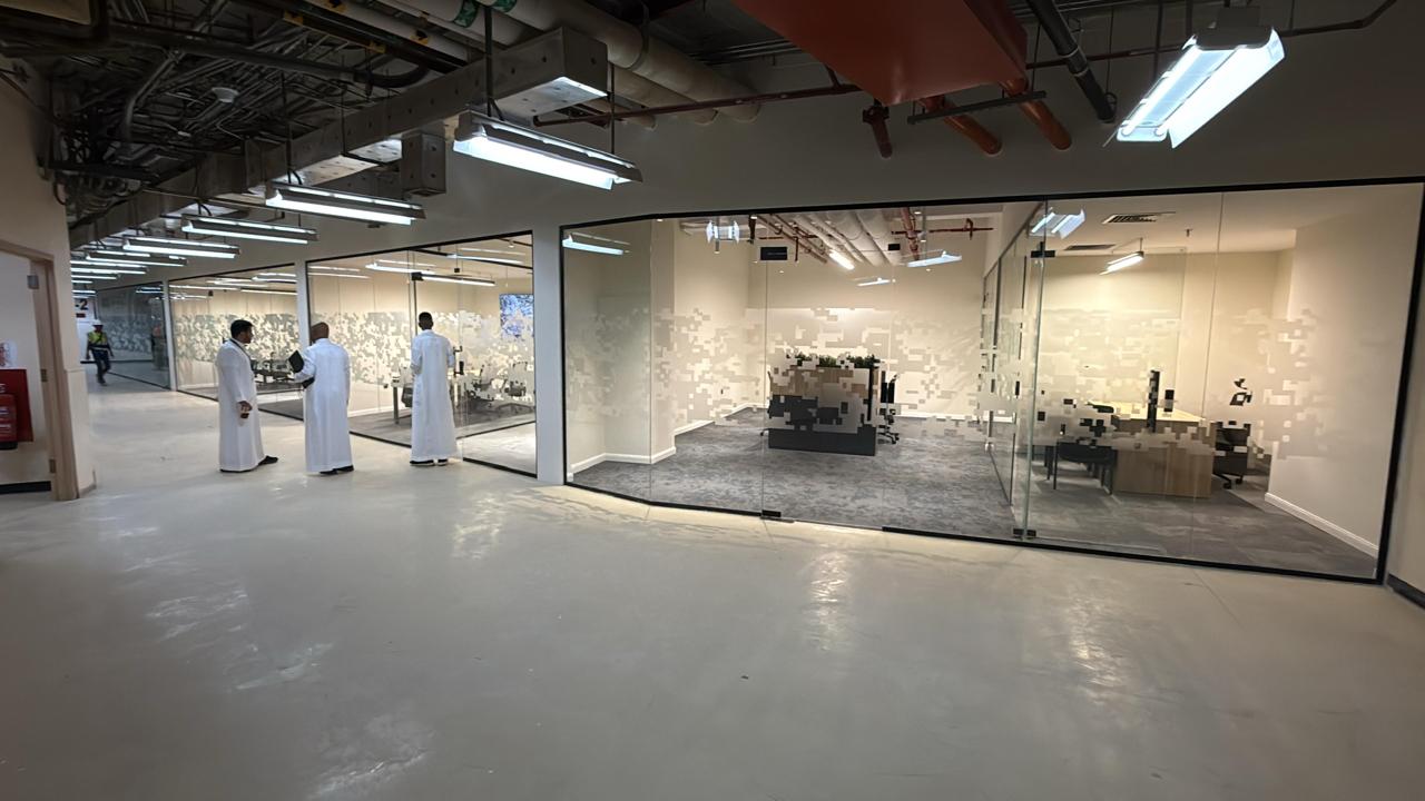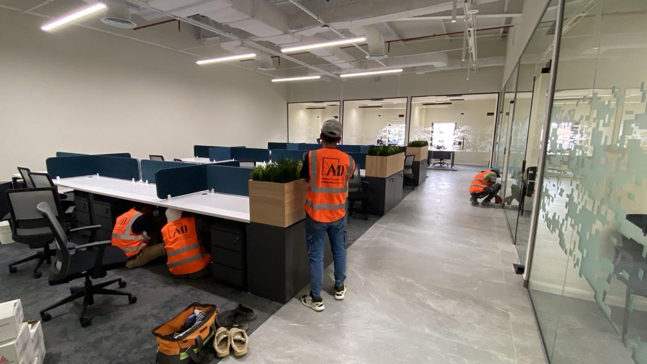 المساحه 650متر مربع المده 25 يوم إزالة أرضيات البلاط القديم وتاسيس سباكه وكهرباء وعمل جبس بورد وتركيب دكتات التكييف وتركيب زجاج الفواصل وتوريد الاجهزه الالكترونيه والاثاث المكتبي بالكامل