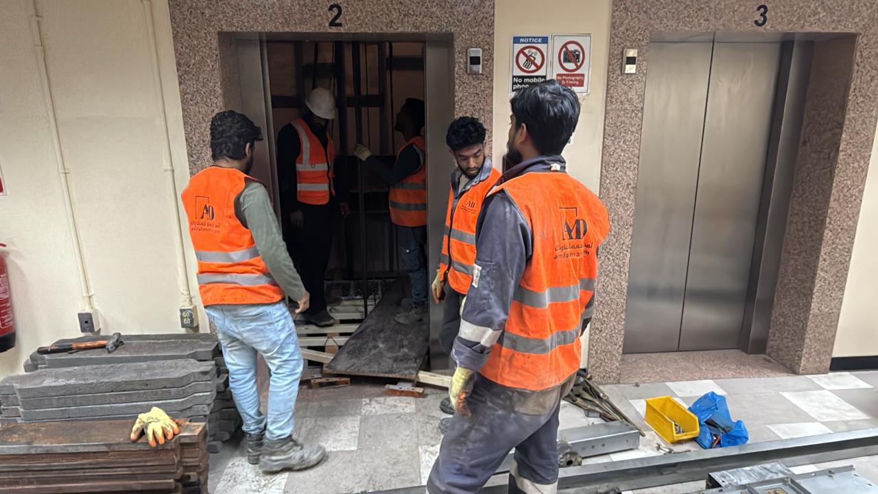 حلول ميكانيكية متكاملة: إنجاز تركيب مصعدين كهربائيين بارتفاع خمسة طوابق، مع تطبيق طلاء الإيبوكسي الفاخر لضمان أقصى درجات المتانة ومظهر مهني عصري."